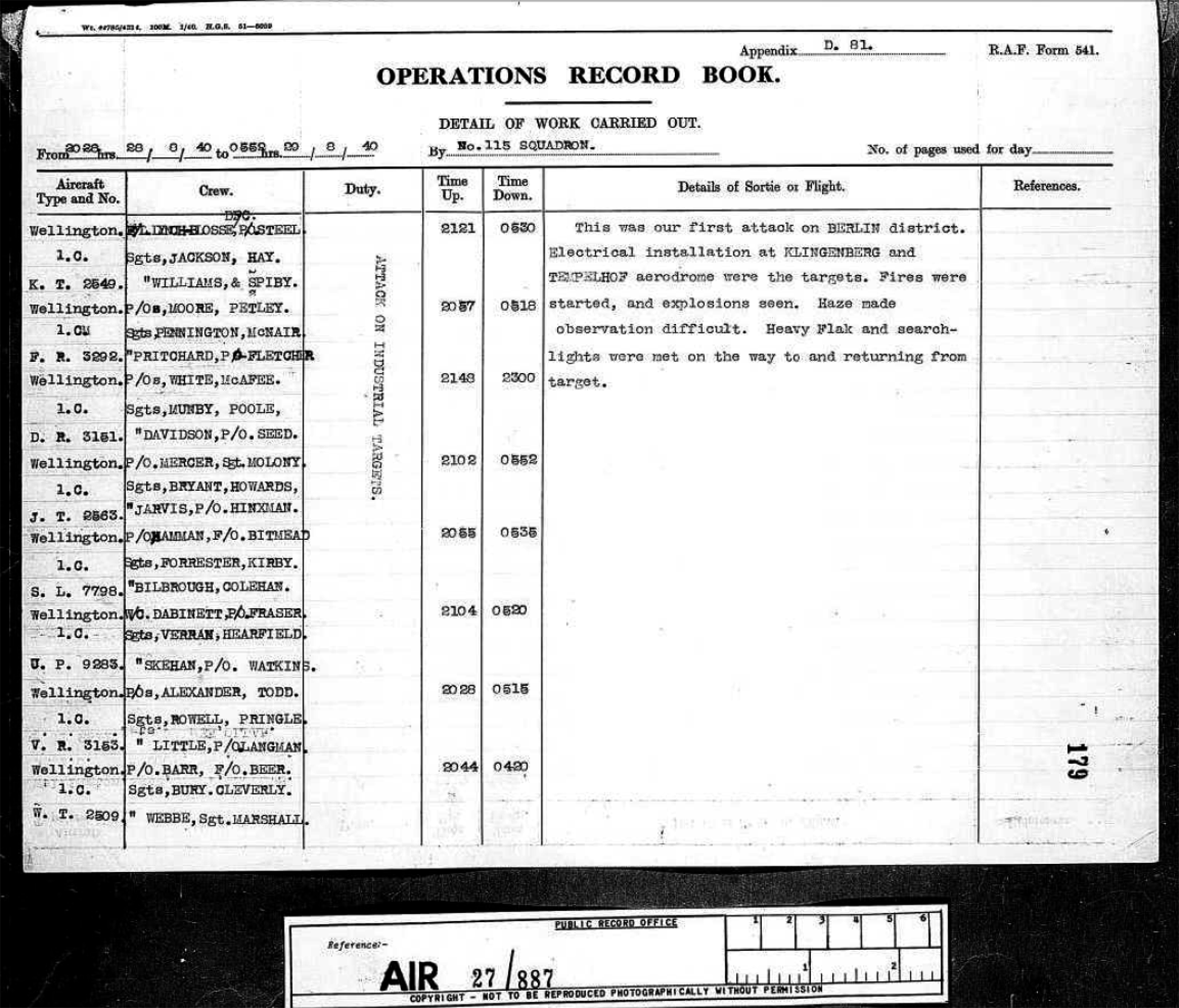 Ironically, they had missed the first raid two nights earlier. Marham’s bomber squadrons, departing that night from Norwich airfield as advanced base to conserve fuel, visited the German capital for the first time on the night of 28/29 August when 47 Hampdens and Wellingtons bombers were sent to raid Berlin. RAF Marham contribution to the raid were nine bombers from 115 Sqn and nine more of 38 Squadron. The Squadron’s ORB (Operational Record Book) recorded about this raid: ‘This was our first attack on BERLIN district. Electrical installations at KLINBERGERG and TEMPELHOF aerodrome were the targets. Fires were started, and explosions seen. Haze made observation difficult. Heavy Flak and searchlights were met on the way to and returning from the target.’ It shows that the first bomber took off at 20.28 hrs and the last landed back at 05.52.