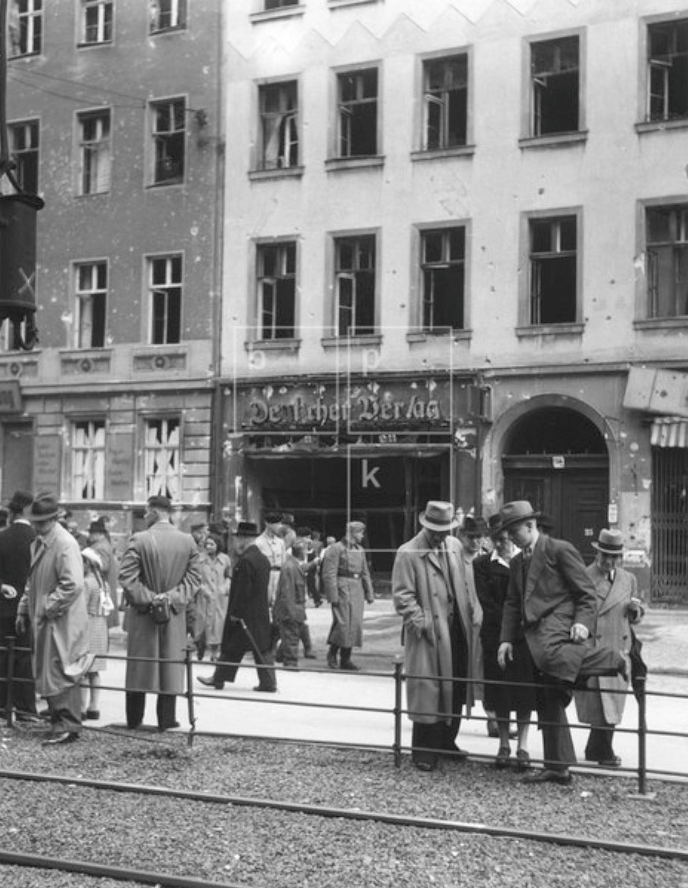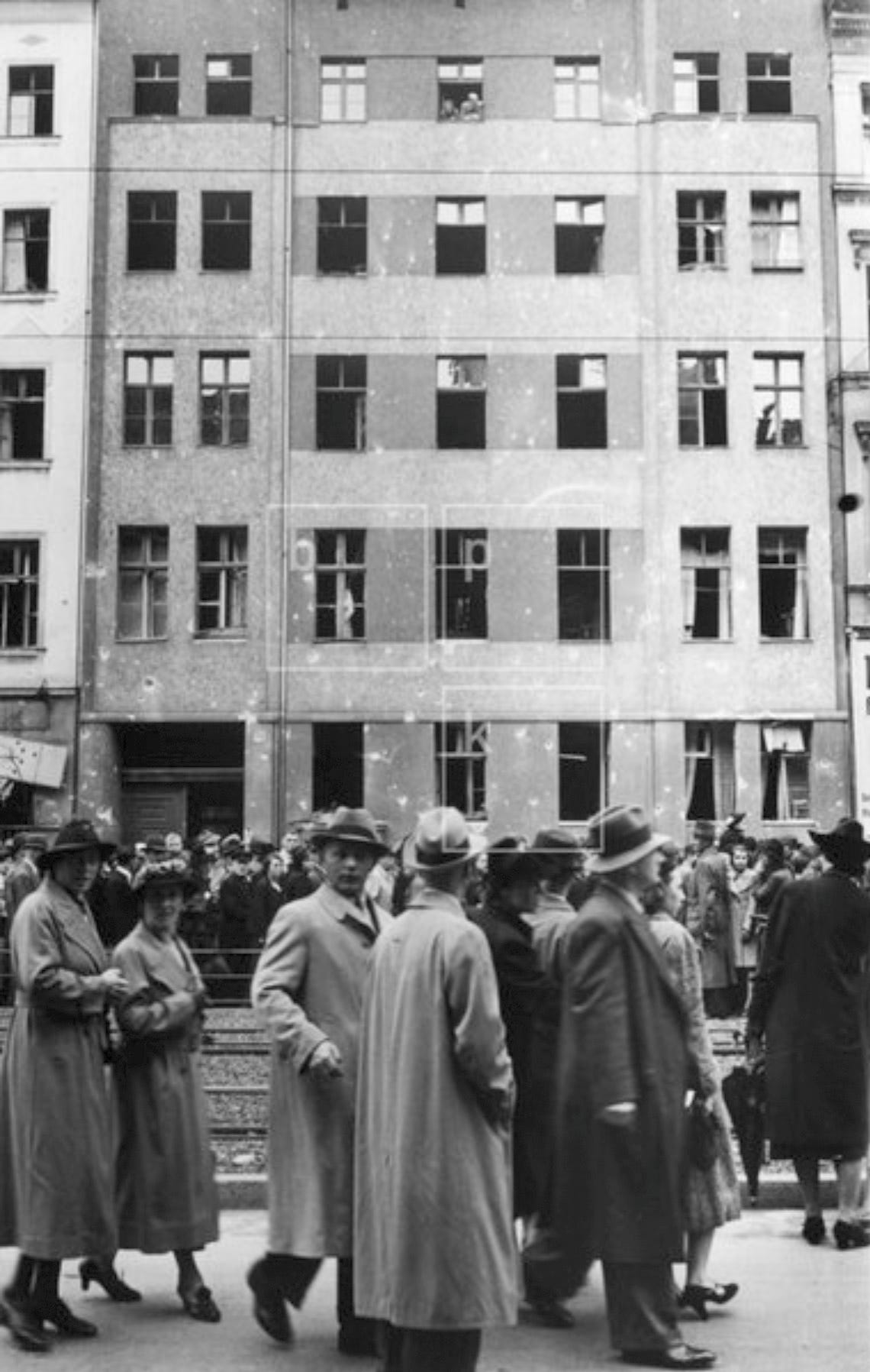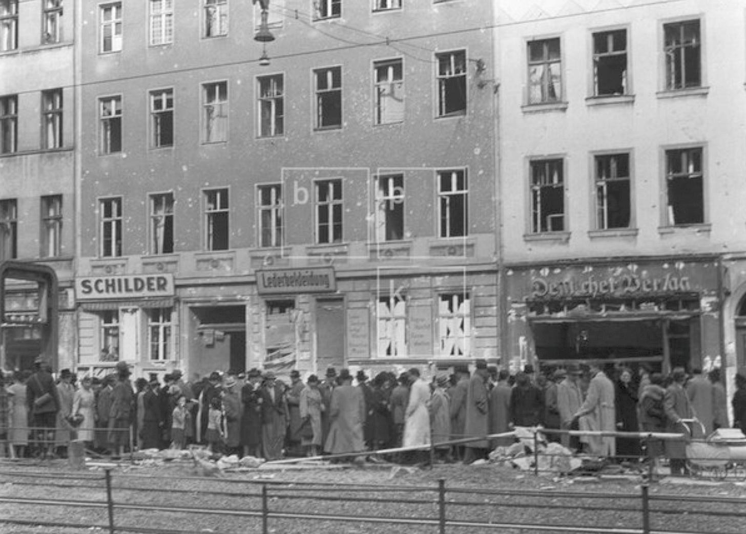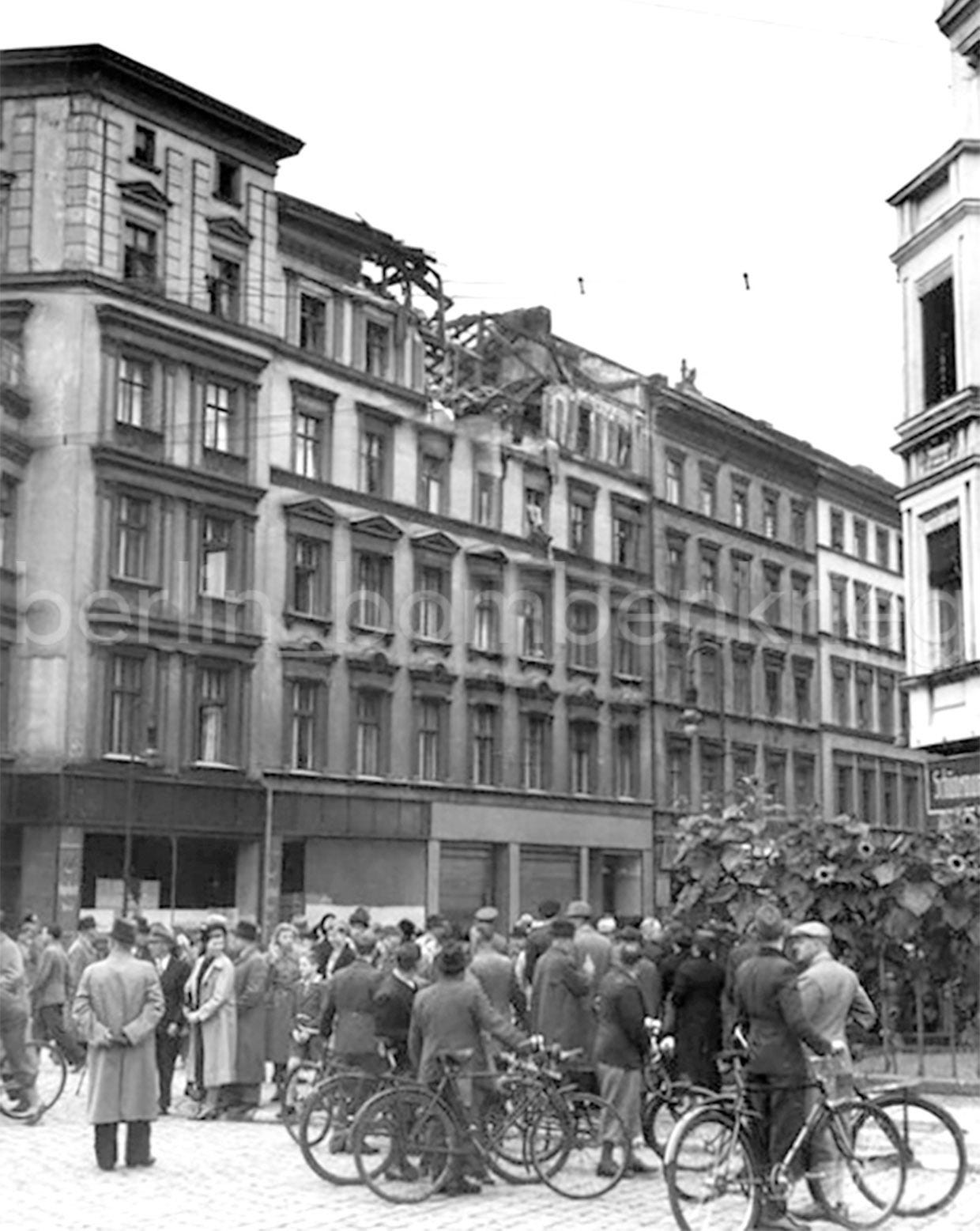A few metres away, a crowd gathers in front of the bomb crater which caused severe damage to the pavement and the tram lines at Kottbusser Straße in Kreuzberg is repair on the following day. Notice at extreme left the U-Bhf entrance (Kottbusser Tor) in front of street number 24-26, with nearly all windows smashed and facades shattered by bomb splinters.