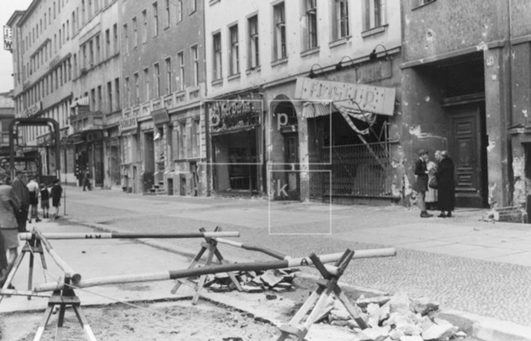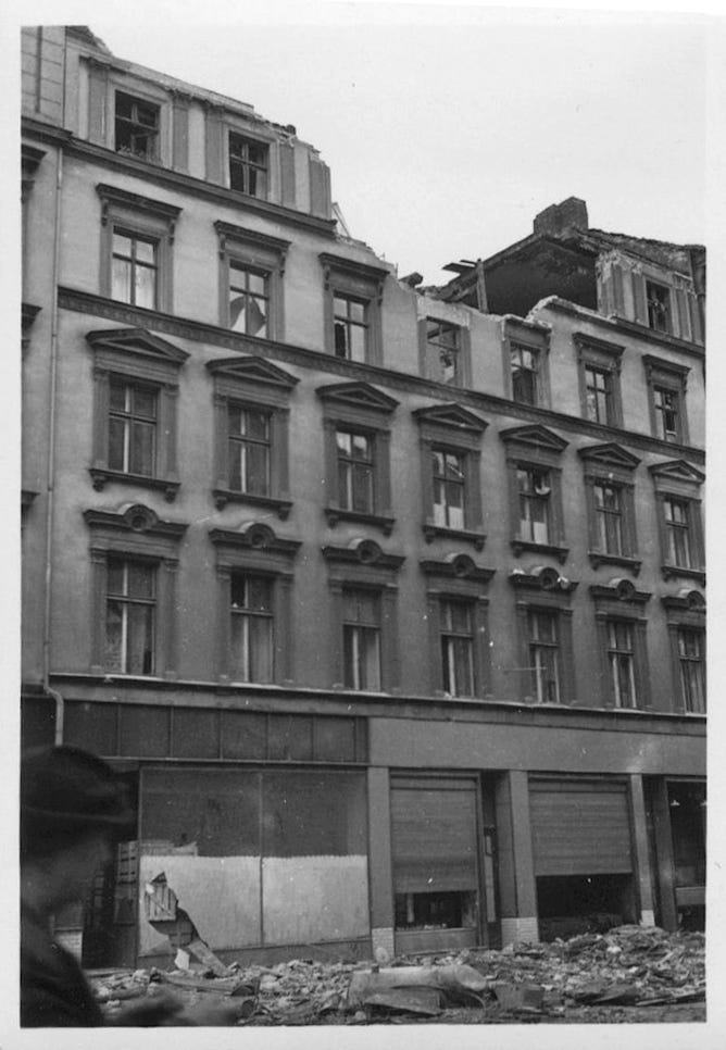 Around the corner, the roof structure of Mariannenstraße number 26 apartment was thrown into the street by explosive bombs, we can see here the severe damage taken by the building’s last floor.