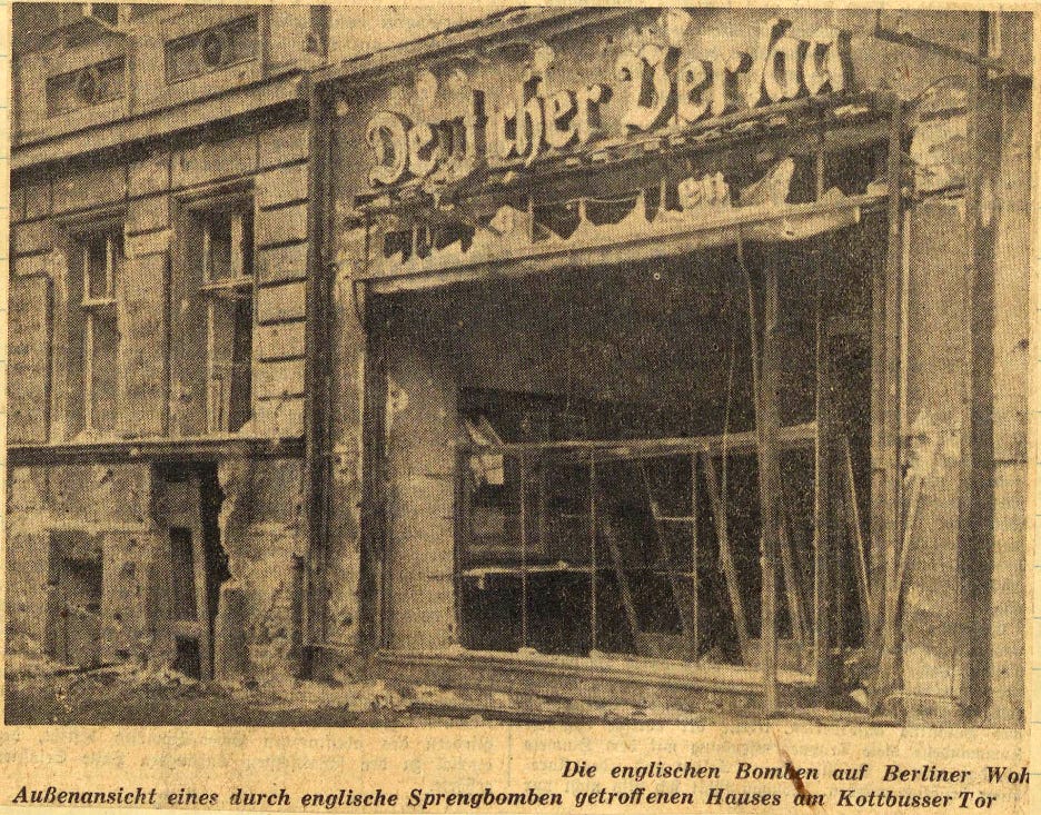 American correspondent William Shirer described the aftermath the next day on his radio broadcast from Berlin: ”About an hour after the raid, the Propaganda Ministry conducted the foreign correspondents around the city to observe the damage. In the Kottbusserstrasse, about a thousand yards from a railroad station in the south-east part of Berlin, two 110 pound bombs had landed in the street, torn off the leg of an air raid warden standing at the entrance to his house, and killed four men and two women who, unwisely, were standing in the doorway.” (This Is Berlin, Random House, 2013)