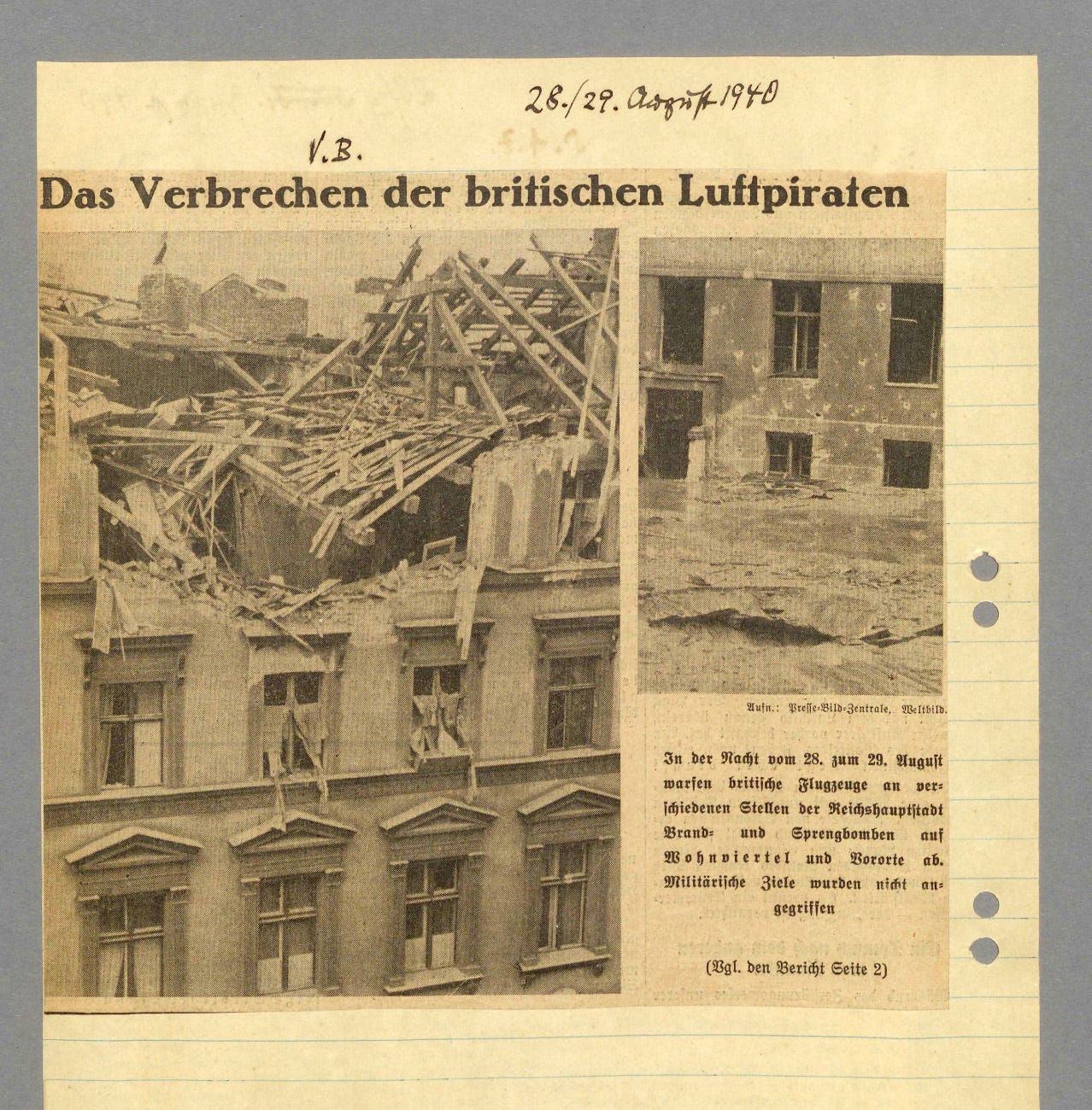 After having a first taste of the air war on Berlin two nights before (25/26 August), Nazi-authorities didn’t release any image of the bomb destruction just describing it as ‘minor’ and without impact on the city. By contrast, after this second British air attack, the German press and neutral photojournalist were rushed the very next day to the Kreuzberg district to take pictures of the bomb damage to the streets and apartment buildings on that area, in what was a clearly policy change by the Nazis, now using them to denounce to the world that the RAF has attacked residential areas dropping bombs over civilians.