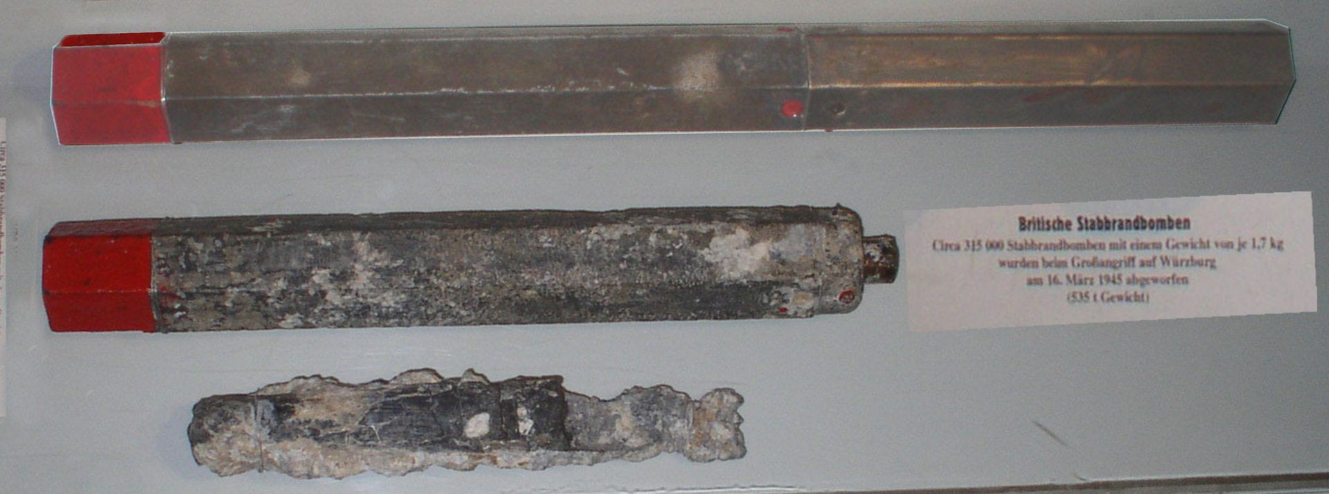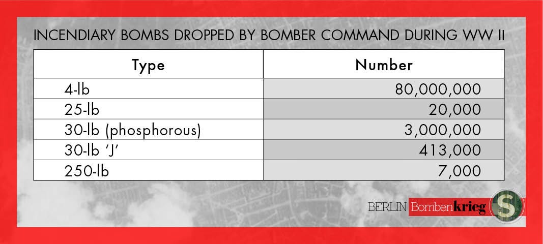 The other main type of incendiary-bomb dropped by Bomber Command was the 30-lb J-Type IB phosphorous. The Germans considered this a ‘morale weapon’ because it was impossible to extinguish with water due to its benzon-gel and was stronger than 4-lb IB. Regardless of its short life span of this type of bomb on the war over 400,000 were dropped.