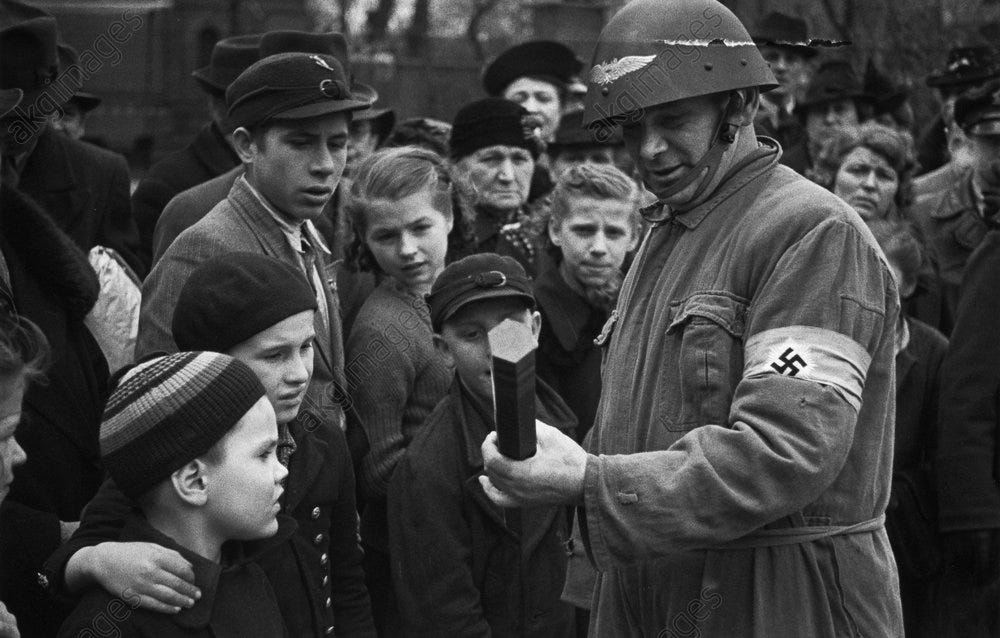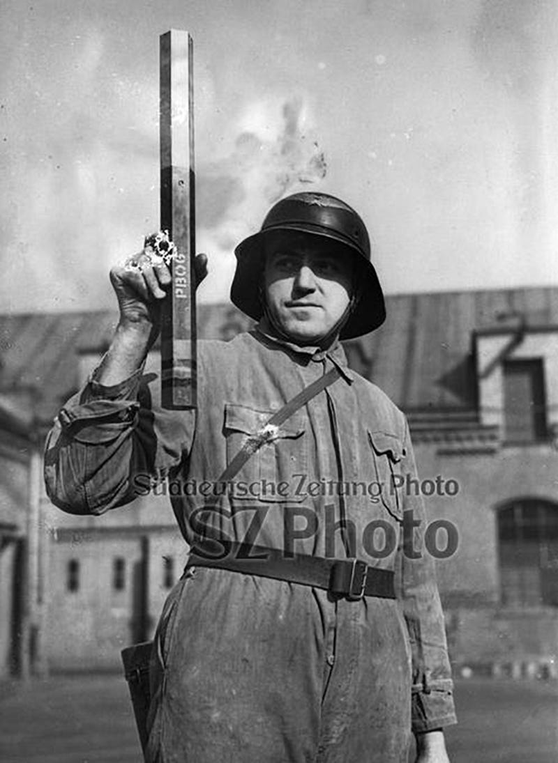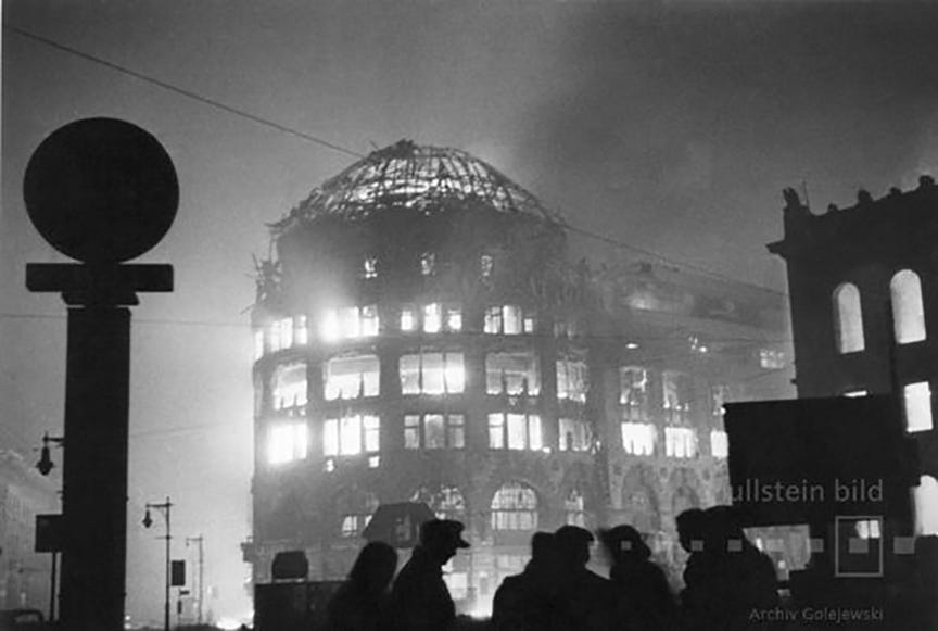 Haus Vaterland (“Fatherland House”) burns following a night raid on 22/23 November 1943 by British RAF bombers. The building was a pleasure palace on the southwest side of Potsdamer Platz. At left, a S-Bahn signal post.