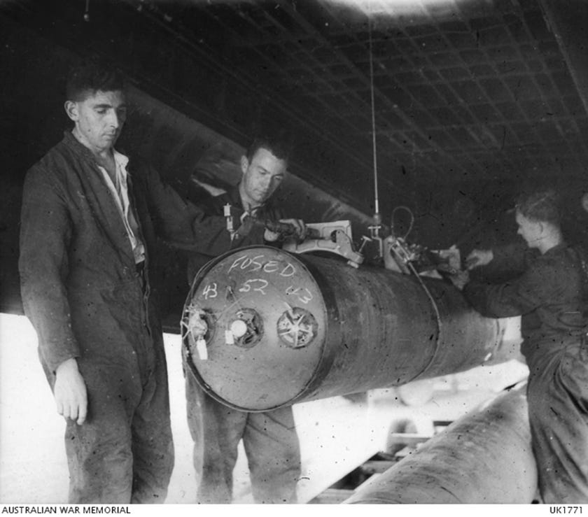 First of the large HC weapons designed was the 4,000-lb HC bomb —the so called ‘Cookie’, required initially as a mine-bomb to drop on naval targets such as harbours and ships. The device had to be able to fit into the Wellington medium bomber bomb-bay and was so big that no bomb trolley was capable of carrying such a bomb at the time. First bomb was ready in November 1940, and the great urgency for the bomb made that several were dropped already in February 1941 (first official use of these new 4,000-pounders were on 31 March/ 1 April 1941 on a raid on Emden). Initial installation of a parachute was dropped later by Air Staff but a nose spoiler was fitted to improve ballistic performance. By August, 226 bombs had been dropped but the type was not officially part of the Command’s inventory until January 1942. Their usual weight was 3,930-lb (1,786 kg). From February 1943 a new ‘proximity fused’ type of 4,000-lb HC bomb, with a wide blast-effect, was used when four Lancasters dropped them for the first time on La Spezia port in Italy.