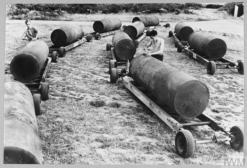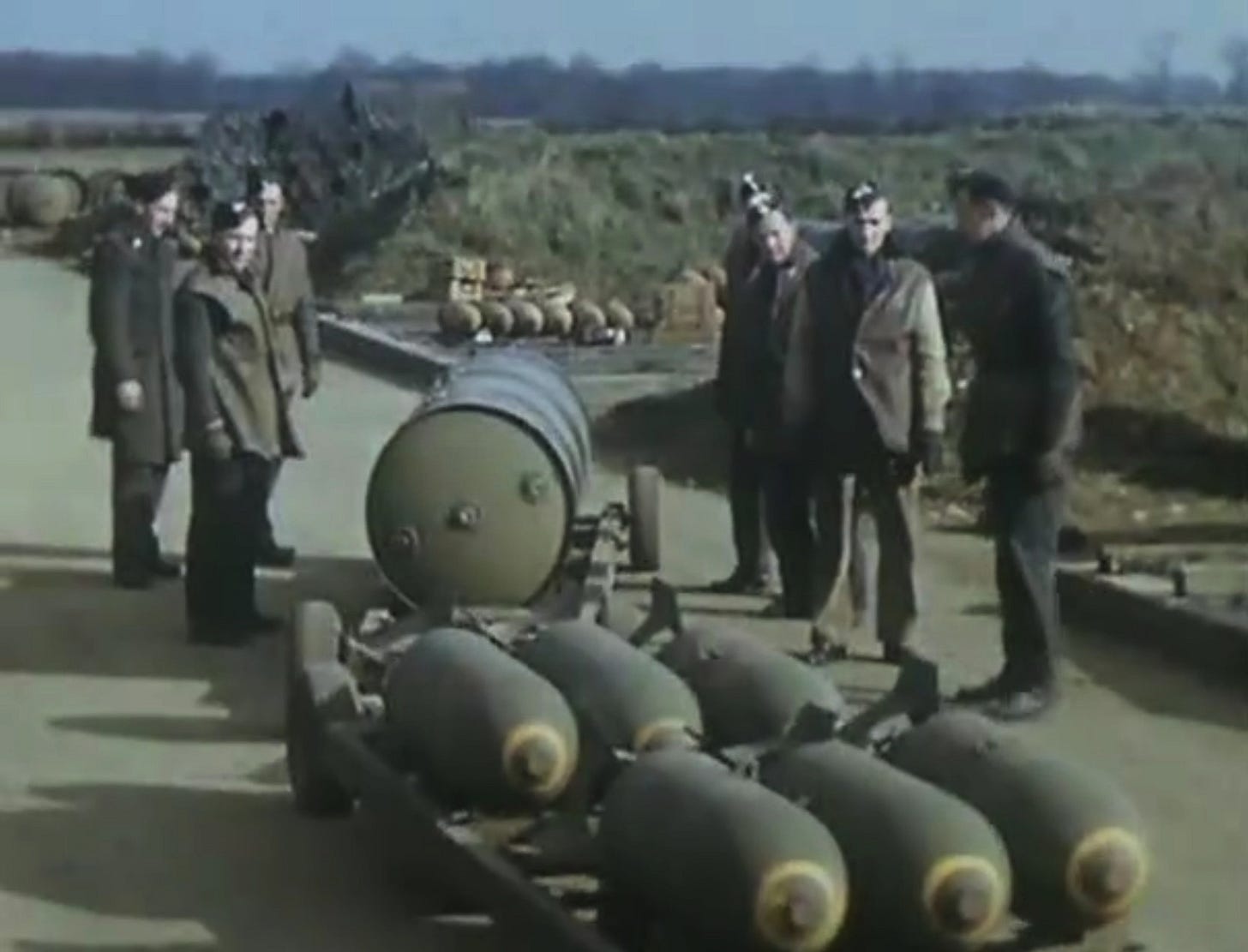 The following image summarizes part of the RAF’s blast-bombs family: armourers show off bombs for a comparison in size at the bomb dump at RAF Woodhall Spa, Lincolnshire. In the front are 1,000-lb and 500-lb MC bombs, behind them a 2,000-lb HC Mark I, then a 4,000-lb HC Mk III or Mk IV ‘Cookie’. Finally, at the rear, is a 12,000-lb HC ‘Blockbuster’.