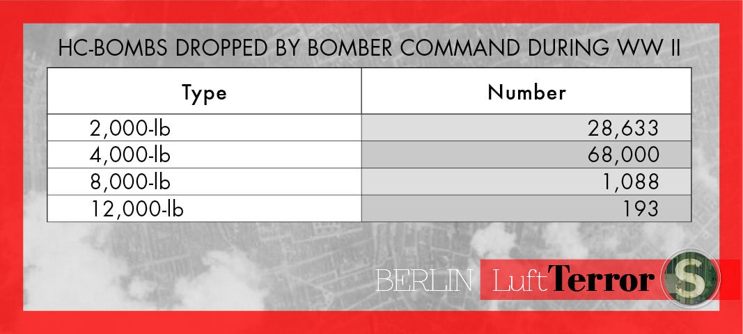 This table shows, by type, the number of HC-bombs dropped by RAF Bomber Command during World War 2. Source: Burls, Nina. RAF bombs and bombing. ROYAL AIR FORCE HISTORICAL SOCIETY. Journal 45. 2009.