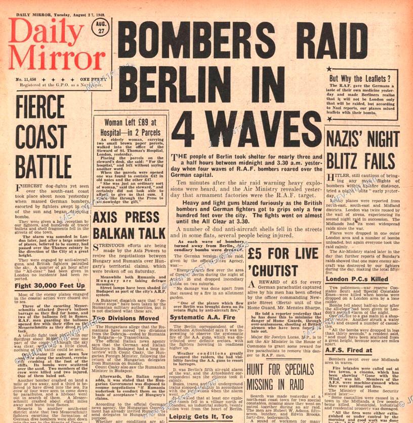 Daily Mirror, Tuesday, August 27, 1940; Berlin arms factories bombed in three-hour raid,The Guardian, Tuesday, August 27, 1940