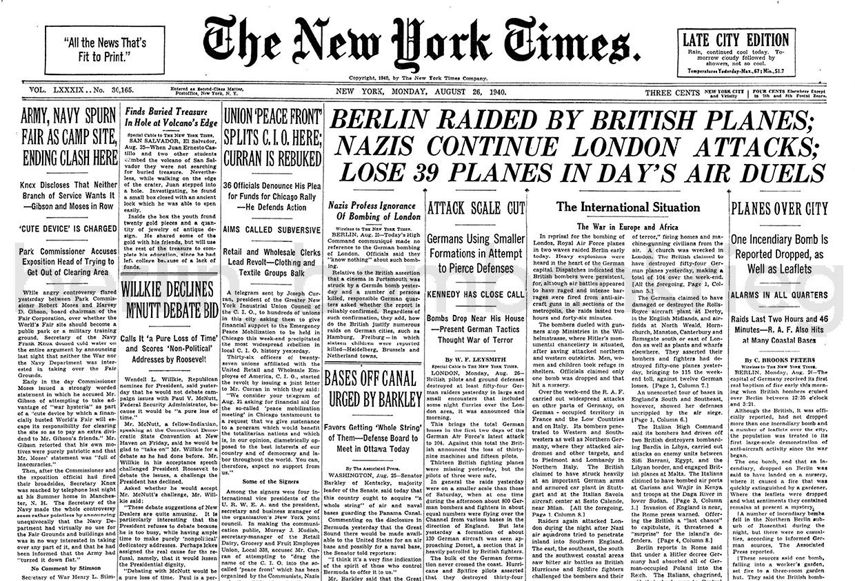 Daily Mirror, Tuesday, August 27, 1940; The Evening News, Monday, August 26, 1940; BRITISH BOMBERS FLY OVER BERLIN by C. Brooks Peters wireless to the New York Times, August 26, 1940, page 2