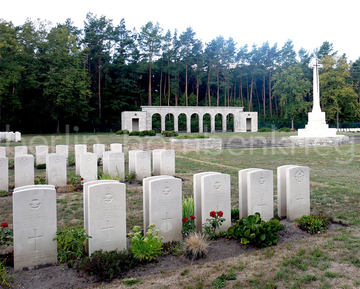 No trace or burial of the other five airmen was found however, so their names are recorded on the Runnymede War Memorial at Englefield Green in Surrey, England (32 kilometres west of London). 20,450 RAF airmen are commemorated there.35