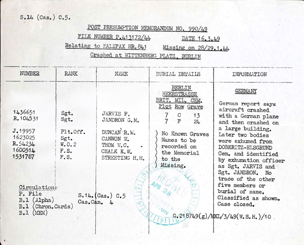 Following the end of the war, the Allied Grave Registration Unit (GRU) tried to locate, register and identify the fate of the dead or still missing airmen, especially casualties on the enemy territory; sometimes the information was obtained several years after the death of those men. In March 1949 the case related to the crew of Halifax HR841 was registered and finally, closed. After the crash, two of the bodies were brought to the Olympiastadion for identification and initially buried at the Döberitz-Elsgrund cemetery (where the Germans concentrated the fallen Allied soldiers, mostly airmen) as the Missing Research & Enquiry Service (MRES) report states. Later identified as the remains of Sgt Jandron and Sgt Jarvis, when the area became part of Eastern Germany in the post war years reburials were carried out to the British cemetery in Charlottenburg, the Berlin 1939-1945 War Cemetery at Heerstraße (part of the Commonwealth War Graves Commission) where both airmen laid to rest today.34
