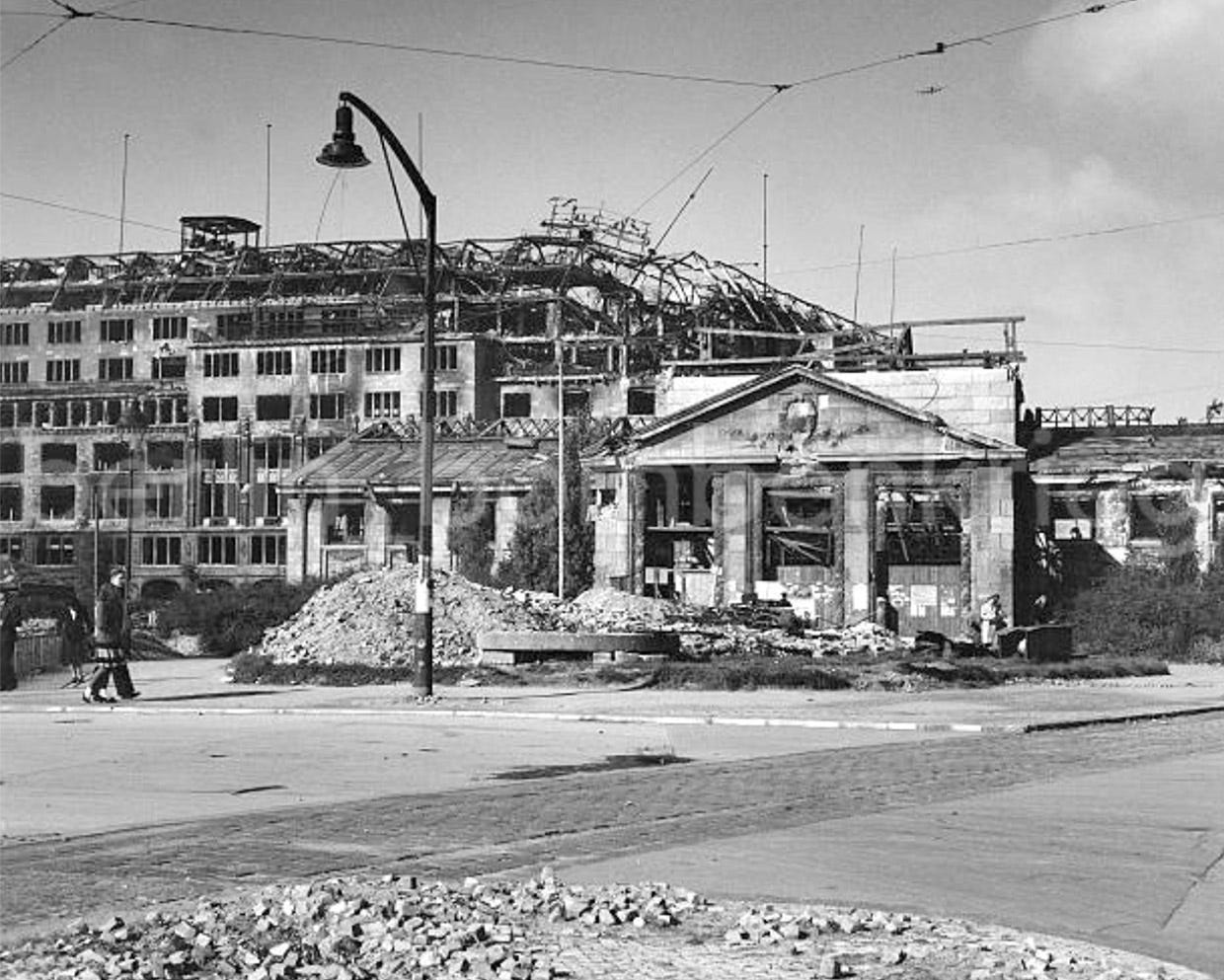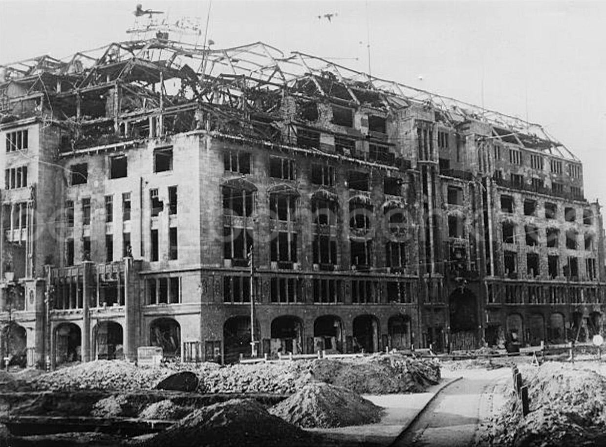 The impact of the falling bomber, a large and heavy aircraft (the Halifax had a wingspan of 31,75 m and a maximum weight of 55,000-lb, including its bomb load) had to be very loud and violent and, of course devastating for the building’s structure. As the bomber did not return to its base nor did any of the crew survived, it is not possible to confirm if it was shot down with the full bomb load aboard or had already been dropped bombs on the city. Known photos of the square taken during the last year of the war —although often wrongly captioned as 1943— shows the building badly damaged, with a burned out roof and the structure totally twisted at the impact point, but still standing. If the aircraft would exploded on impact little or nothing have remained from the famous store after the violent deflagration.