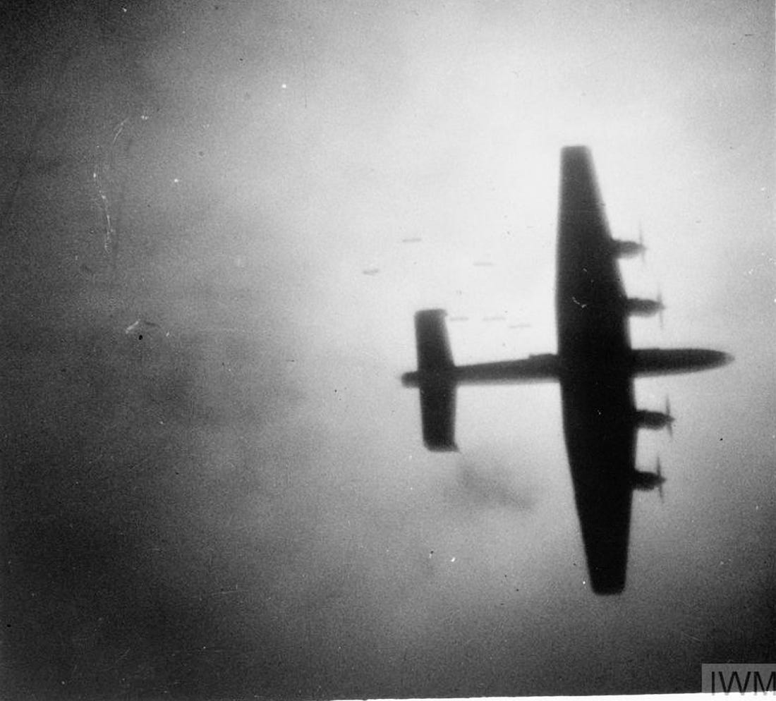 At around 03:20 hrs, amongst a wave of planes, flak bursts and falling parachutes, and illuminated by big fires on the ground, a British Halifax heavy bomber overflies the Nazi capital during another RAF Bomber Command air raid on the city. Seconds later and hit by enemy fire, the four-engined bomber fell in a steep dive from a height of 17,000 feet and crashed onto the KaDeWe building, the famous West-Berlin department store which still exists today at the same location at Wittenbergplatz.