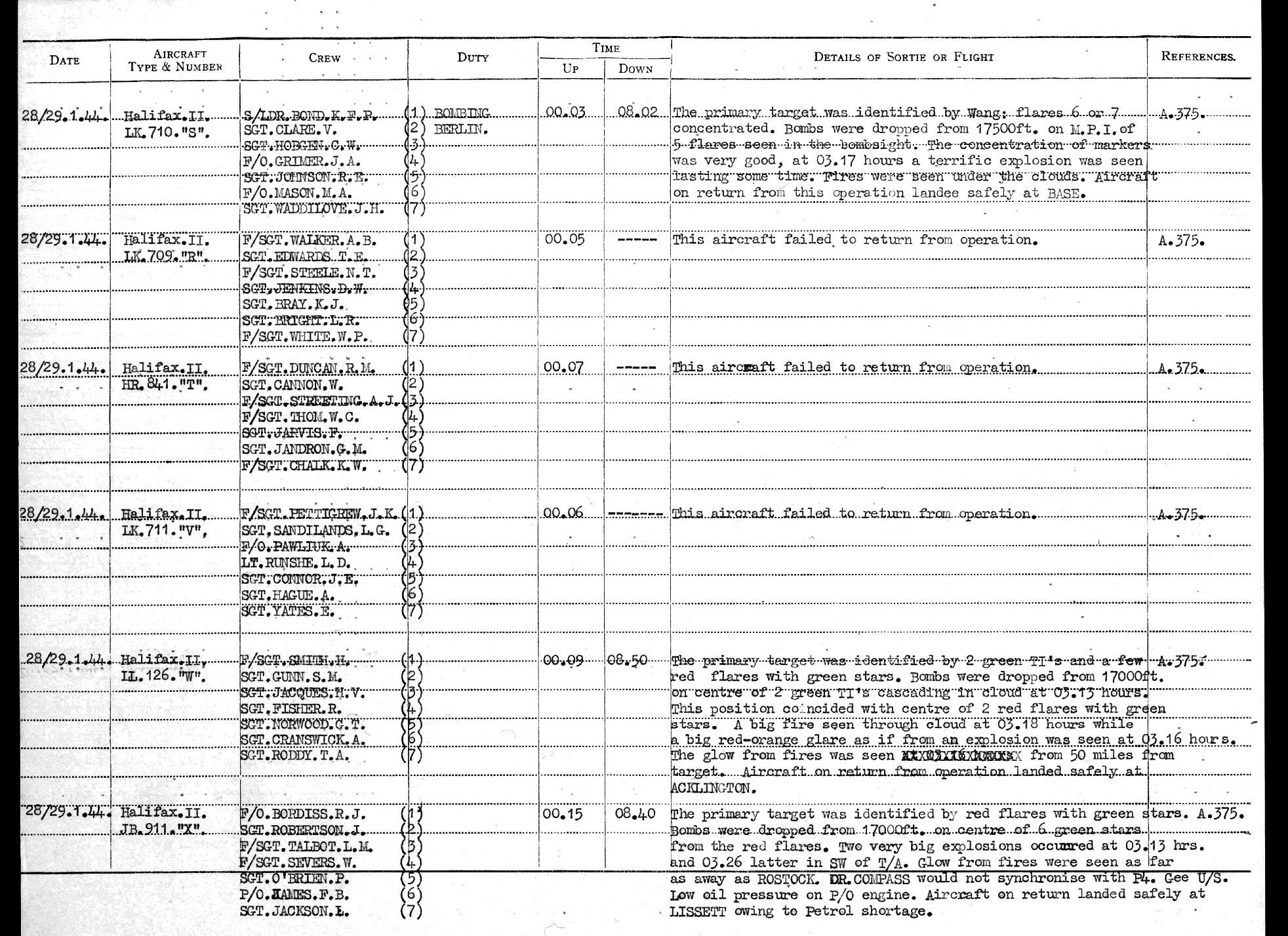 The crew had missed the previous show over Berlin (20/21 January) and ‘their’ Halifax HR841, assigned to another crew on that night (P/O Hogg’s crew) finally did not leave for the German capital either.18 The next day, the crew was ordered to fly to Magdeburg as part of 648 bombers that bombed the city.19 On Friday the 28th, Duncan and his men were detailed to bomb Berlin again.