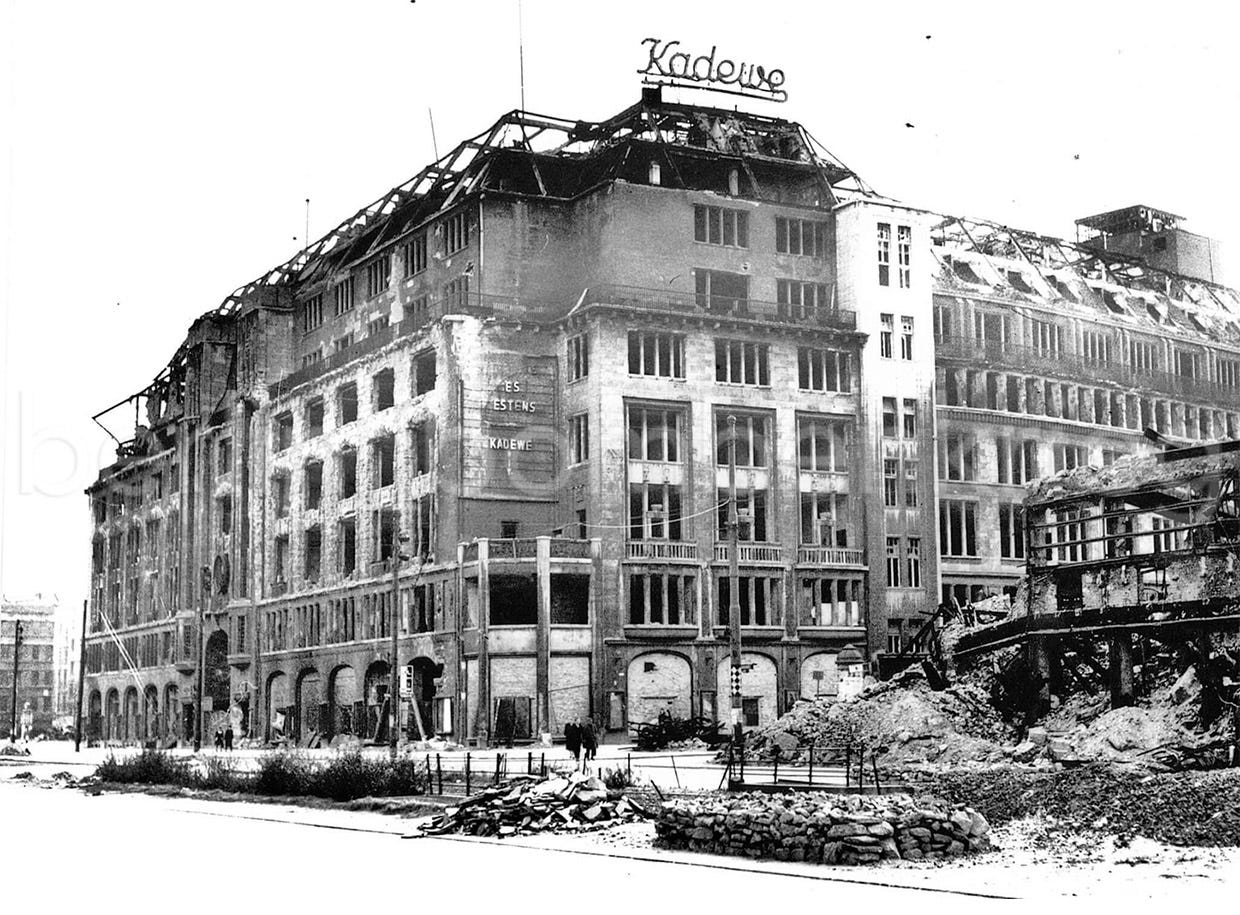 „Im Krieg erlebte das KaDeWe seinen schwärzesten Tag am 24. November 1943, als ein amerikanischer Bomber in den Lichthof des Hauses stürzte, das daraufhin völlig ausbrannte“, quoted in: Hans Aschenbrenner. “3. Juli 1950: Das KaDeWe meldet sich zurück”. ©Edition Luisenstadt, Berlinische Monatsschrift Heft 3/2001