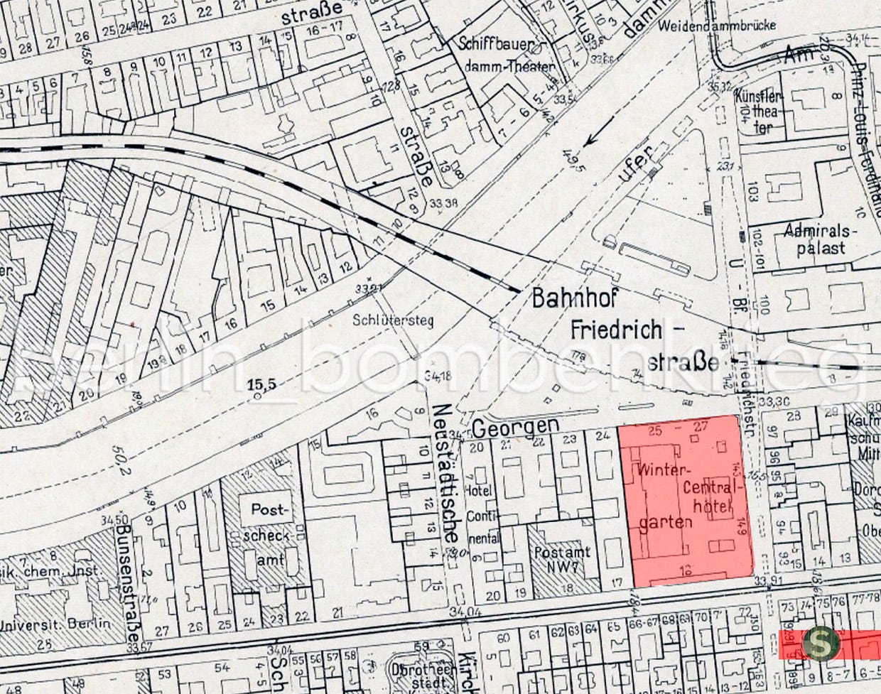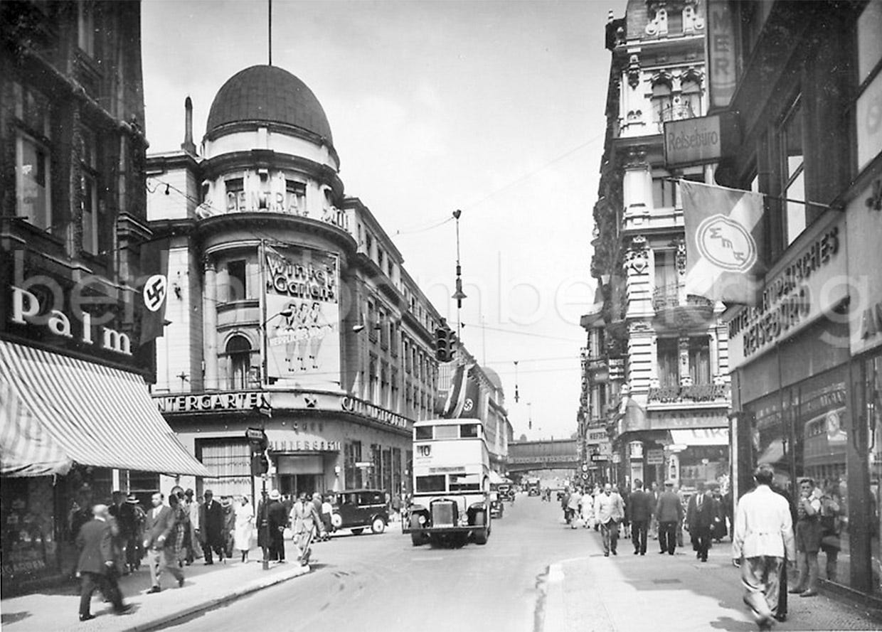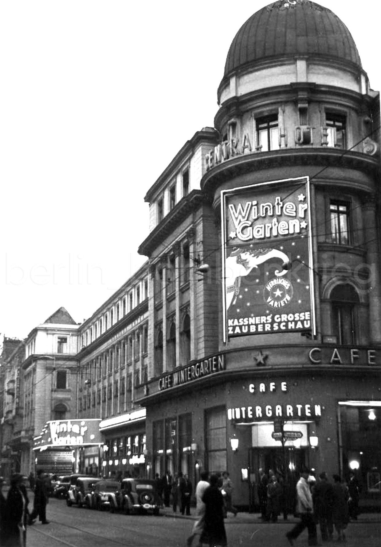 Here are some views of the exterior facade of the Central-Hotel and the WinterGarten (note the station’s railway bridge in the background) in the 1930s, when the German capital was run by the Nazi regime.