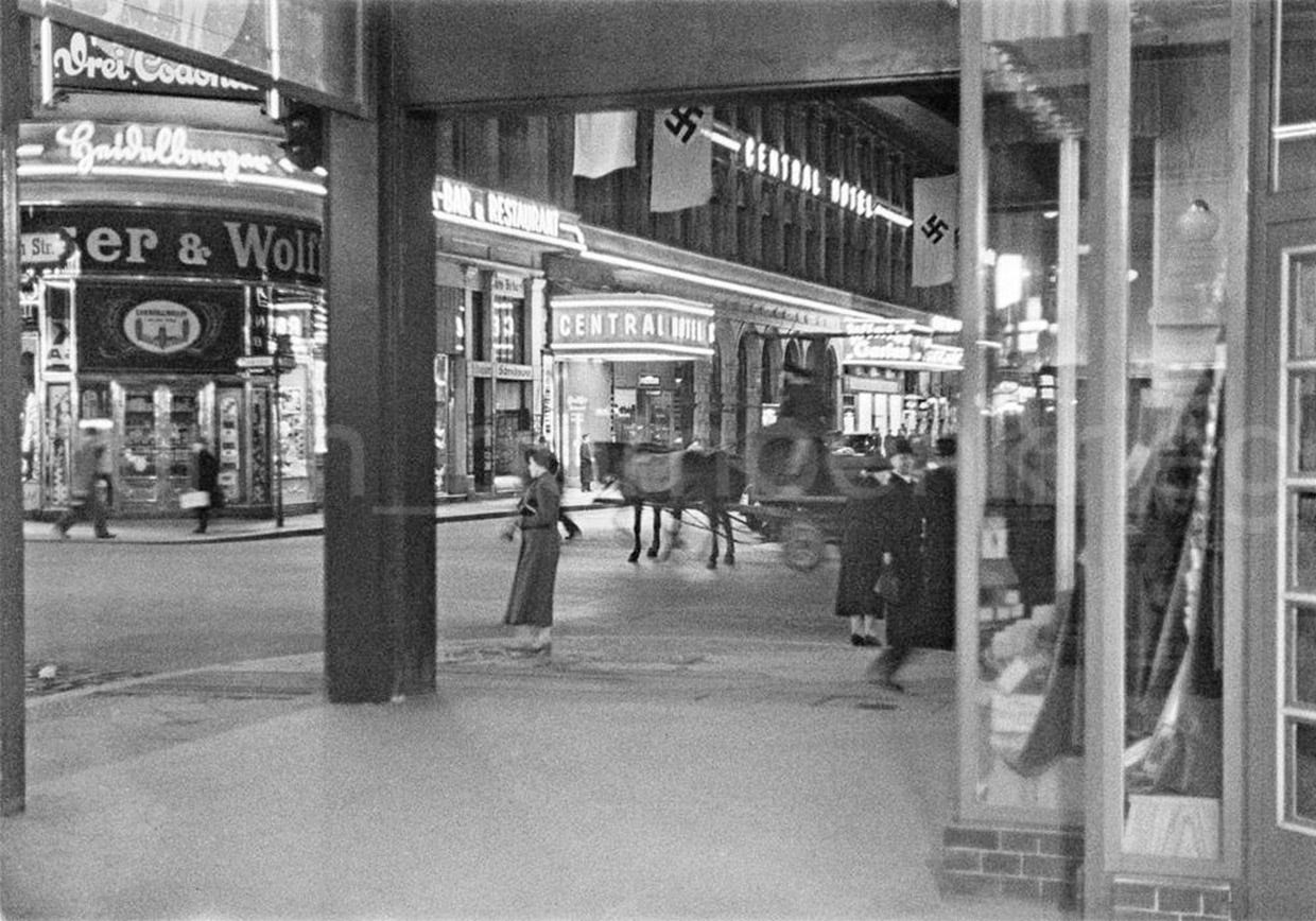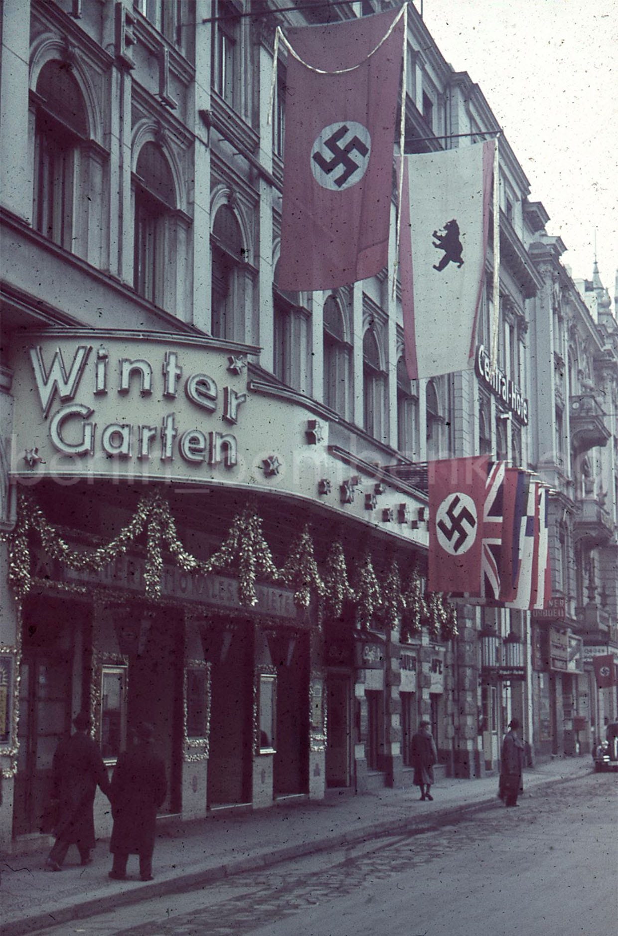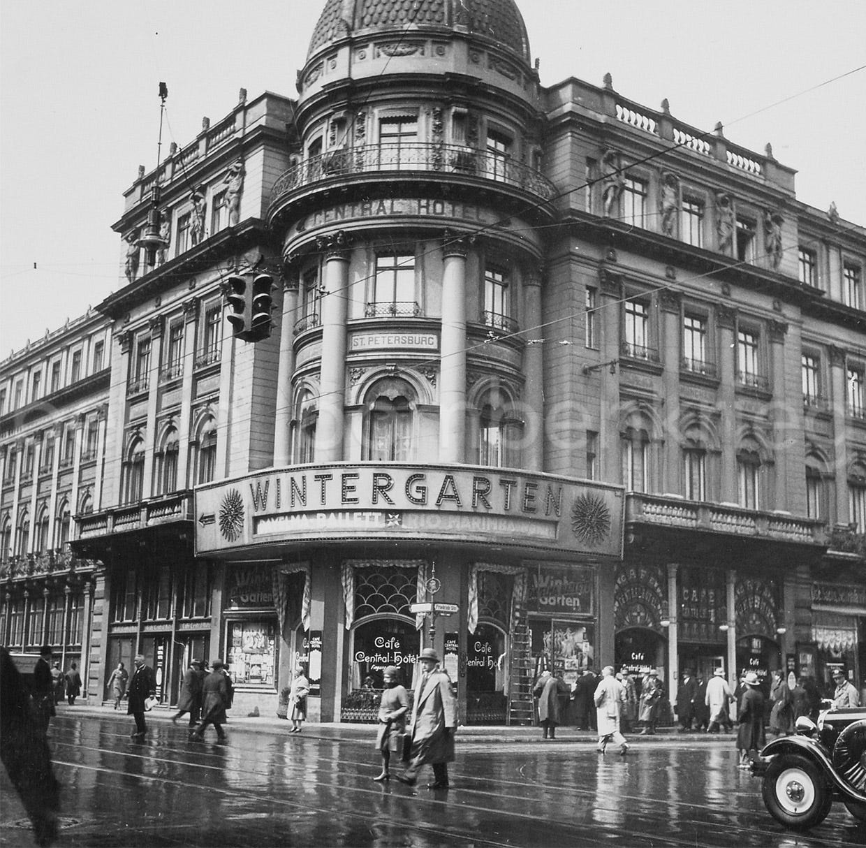 Here are some views of the exterior facade of the Central-Hotel and the WinterGarten (note the station’s railway bridge in the background) in the 1930s, when the German capital was run by the Nazi regime.