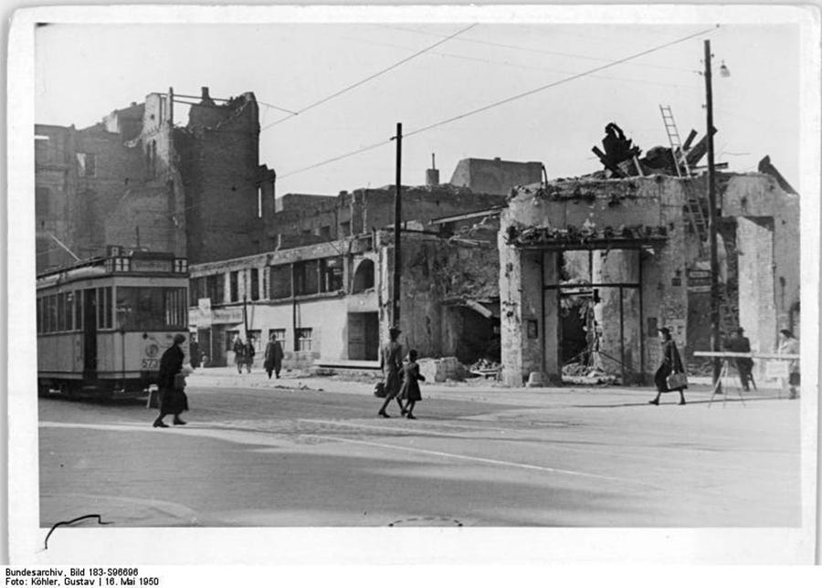 Life goes on: now part of East-Berlin, rubble and ruined buildings still can be seen at the famous corner where Dorotheenstraße meets Friedrichstr. in May 1950.