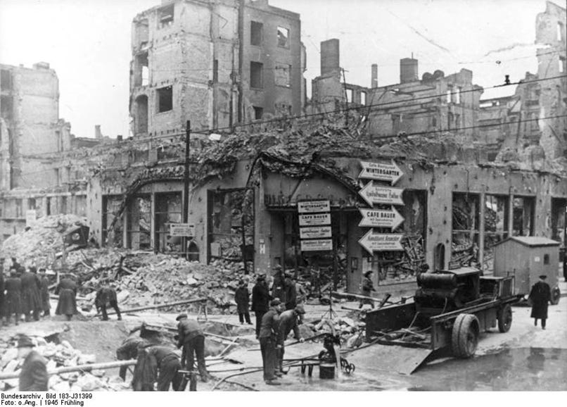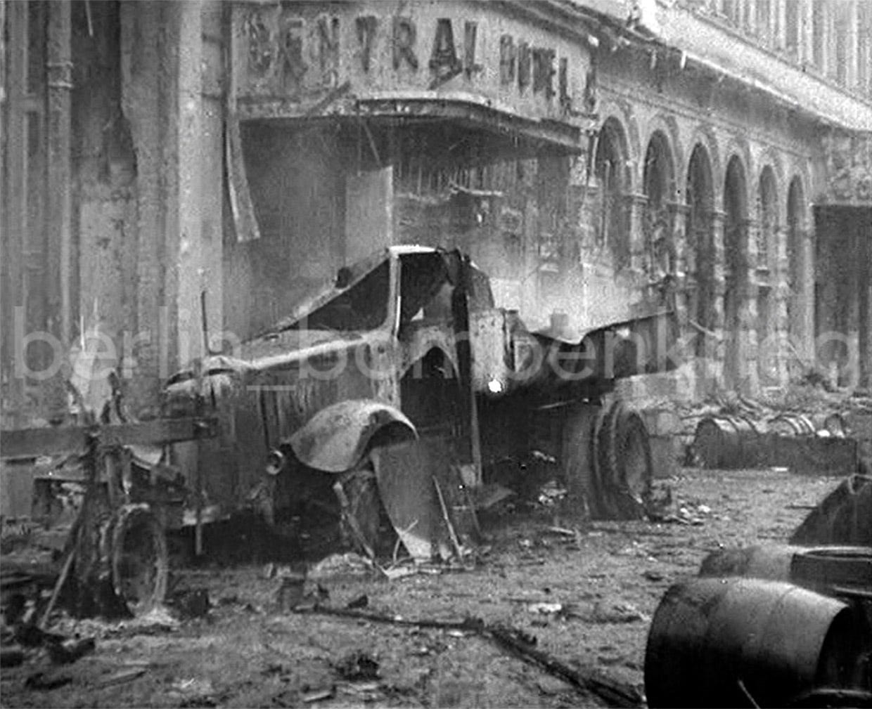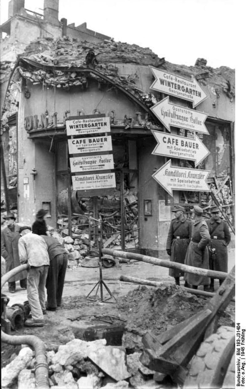 Zerstörungen in der Friedrichstraße, Frühjahr 1945: this extraordinary series of photos was taken by a German photographer on March 21, 1945, in the aftermath of an Allied air raid. Civilians and soldiers can be seen working on a big bomb crater and clearing debris from the street in front of the destroyed Central-Hotel southern corner. Makeshift signs were placed to indicate the ‘new’ location of the Café-Restaurant at Georgenstraße and other displaced restaurants.