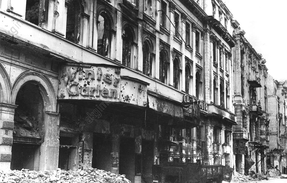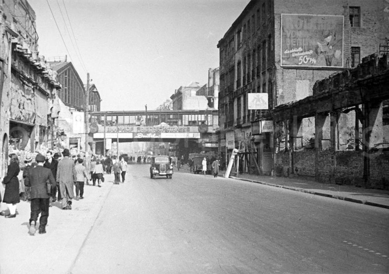 Two postwar views of the Friedrichstraße between Dorotheenstraße and Georgenstr. (note Wintergarten ruins at left), where no building was left intact by Allied bombs, taken circa 1946.