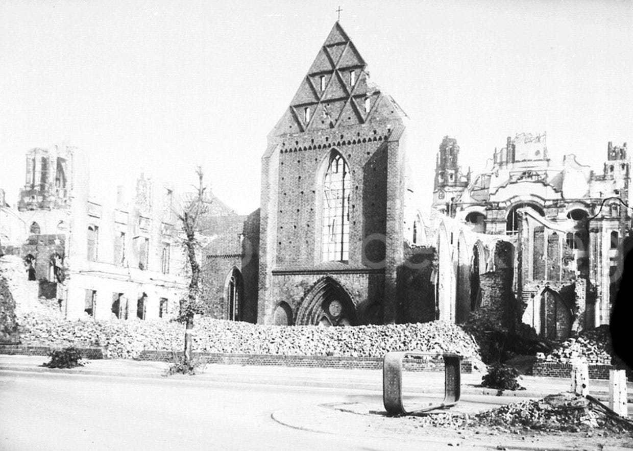 Fifteen minutes before 10:00pm of April 10th, 1945, Berlin’s air sirens wailed one more time, and the 369th air alarm on the city began. By the time they sounded again to indicate Berliners the end of the attack, the Klosterkirche and its adjacent monastery lay ablaze and half-destroyed, mortally struck by an RAF mine dropped by a Mosquito bomber in another nuisance night raid.