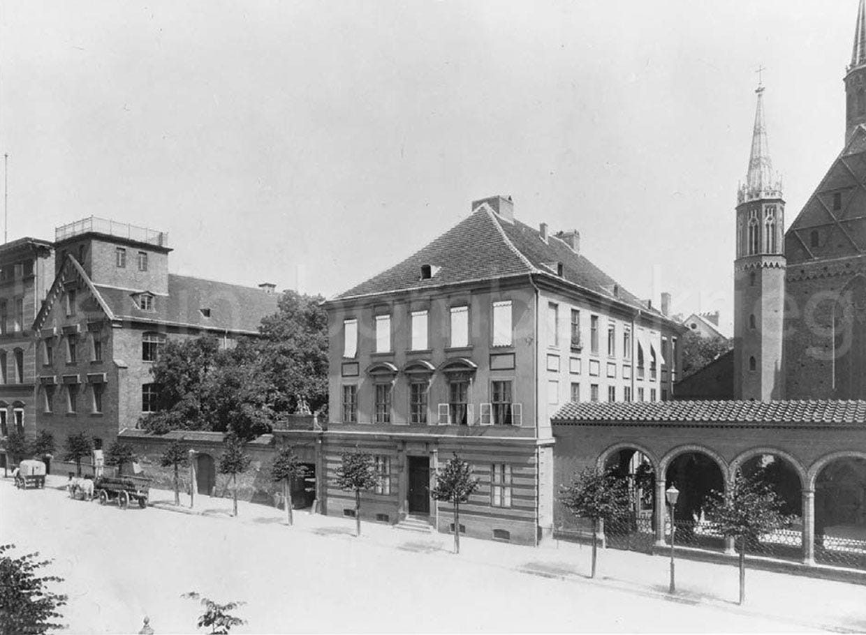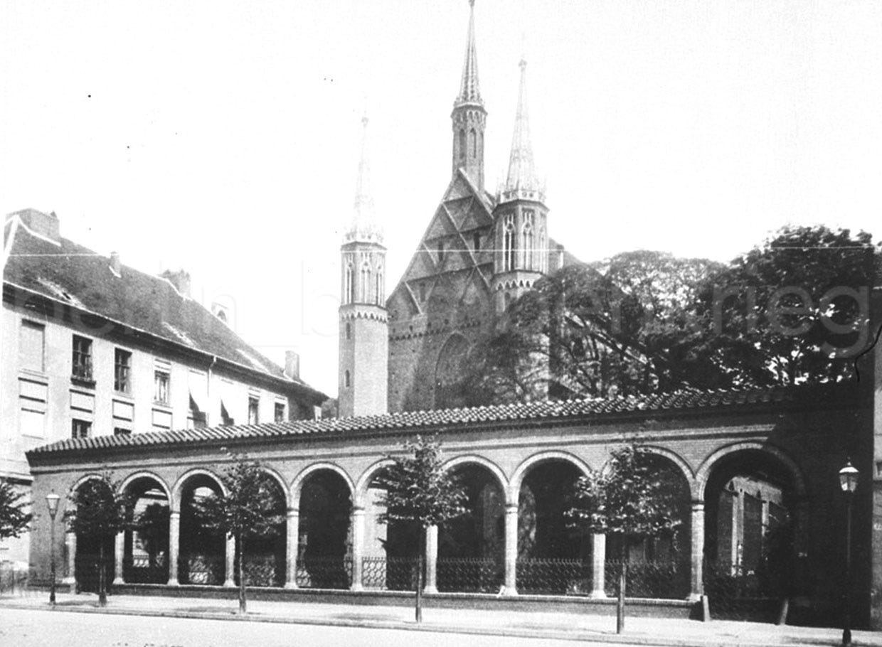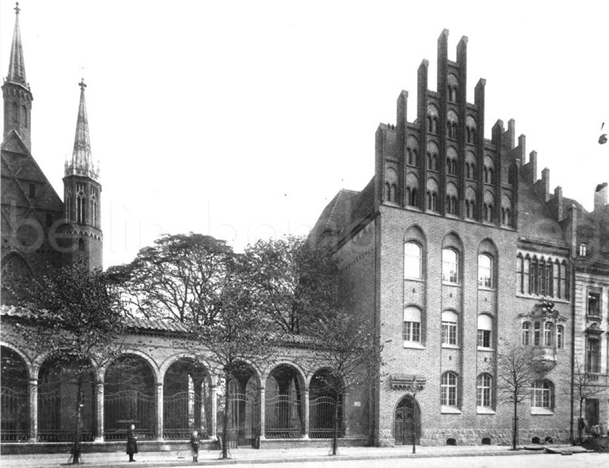 The origins of the Franziskaner-Klosterkirche und Graues Kloster (red marked area in the cover Alexanderplatz photo, at left) goes back to the end of the 13th century when the Margraves of Brandenburg, Otto V and Albert III, gifted the site to the Franciscan order, recently settled in the city. The church, designed as a three-nave basilica with cross vaults, was built in brick Gothic style circa 1250 at the Berlin eastern limits. It is considered the first building in Berlin built entirely of brick. Along with the Klosterkirche, other buildings were successively erected here, including a Franciscans monastery (the Grauen Kloster) and in 1574 an elite high school, the Gymnasium zum Grauen Kloster. Famous students and teachers included Bismarck, Karl Friedrich Schinkel, and Friedrich Ludwig Jahn. With the introduction of the Reformation in Berlin in 1539, the Franciscan convent was dissolved and the church became a branch of the nearby St. Nikolai. The monastery complex suffered several transformations along the centuries, following major repairs and several fires, being expanded during the 19th century and again around 1900.