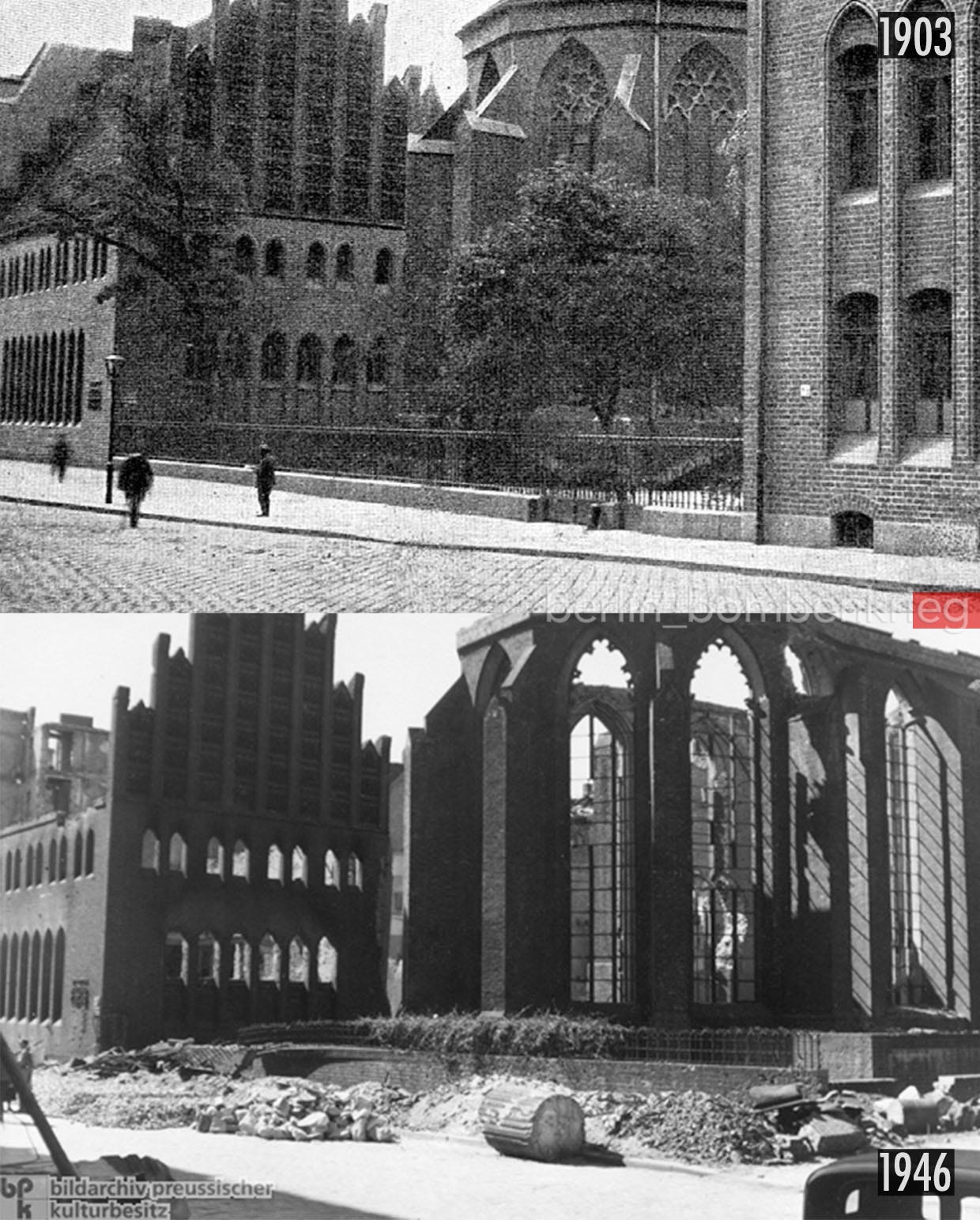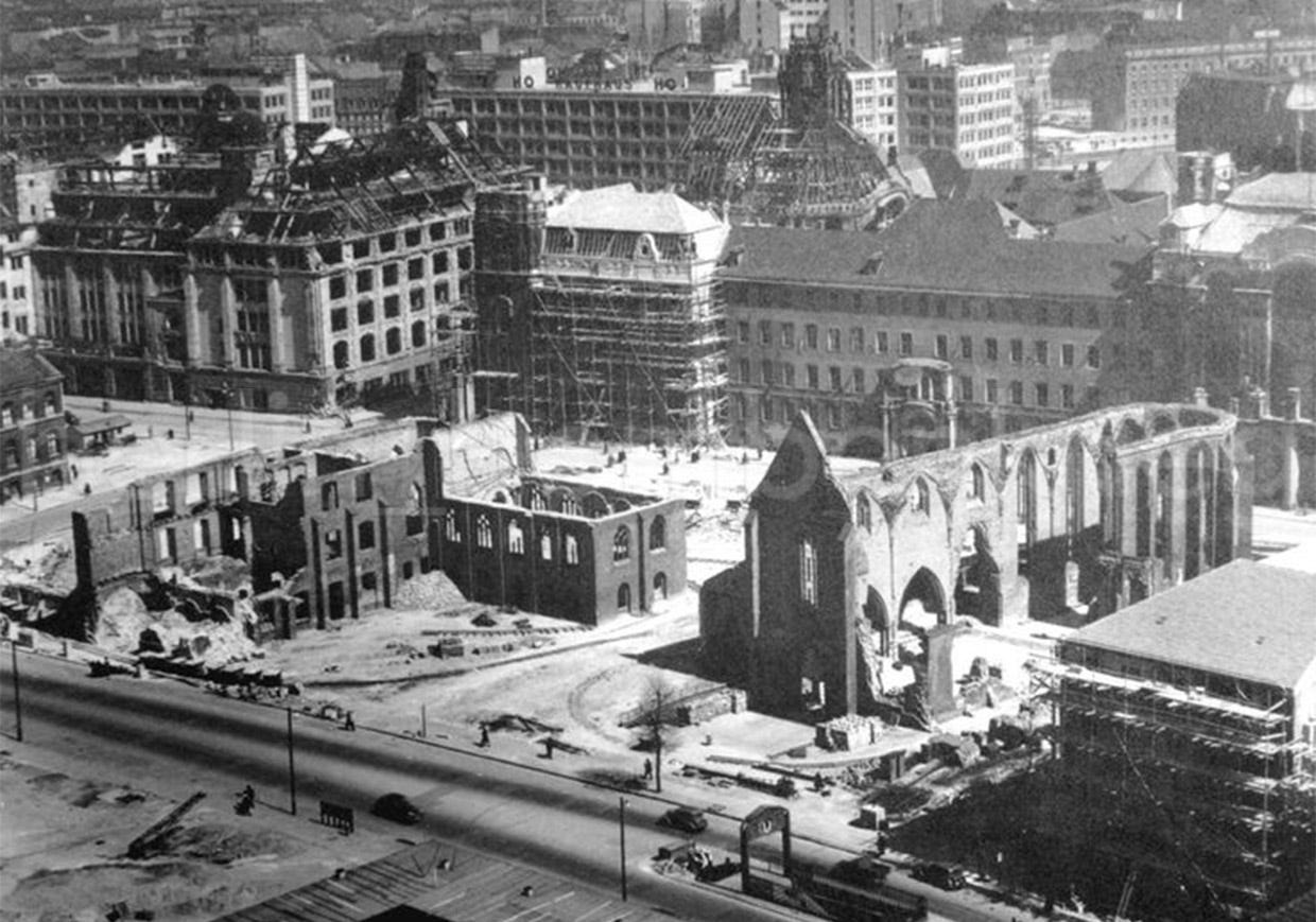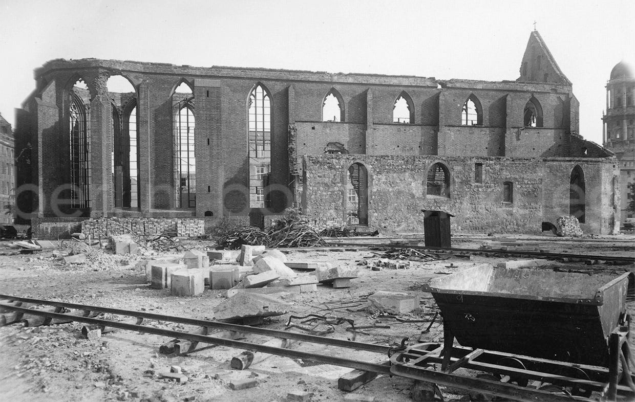 A Then/Now picture showing the original aspect and aftermath of the Kloster complex following the bombing raids which destroyed it in the final months of the war, in this case seen from the Neue Friedrichstraße side in 1903 and 1946.