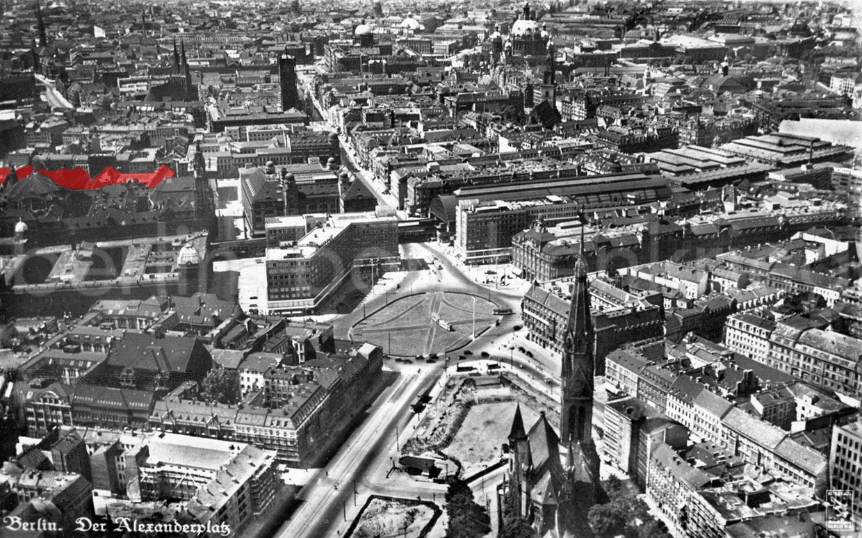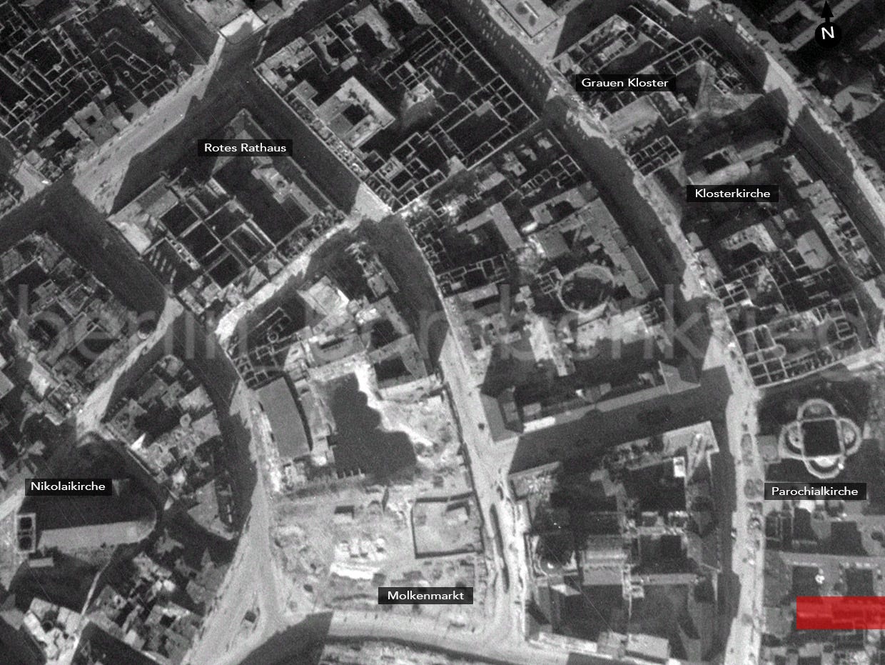 This area of Berlin’s Alstadt was filmed in colour footage by the Stevens/Wyler camera team sent to the ruined city by the US Army in July 1945, with part of Littenstr and Klosterstr shown here looking west. Note the roofless Parochialkirche (built 1695, at top left) mortally hit on the May 24th, 1944, raid and located a few metres from the Kloster complex, part of its ruins of this can be seen at extreme right.