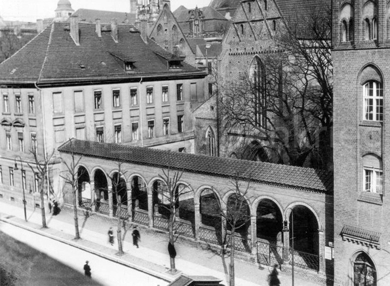 Following are three views of the monastery complex facing Klosterstr as it was circa 1900: First, a view of the western portal of the Gothic style Klosterkirche with its front twin towers, both demolished in the 1930s. Second, the Gymnasium zum Grauen Kloster at the northern side and, finally, a view of the Direktoren- und Lehrerhauses (Director’s and Teachers’ Houses) at the southern end of the complex.