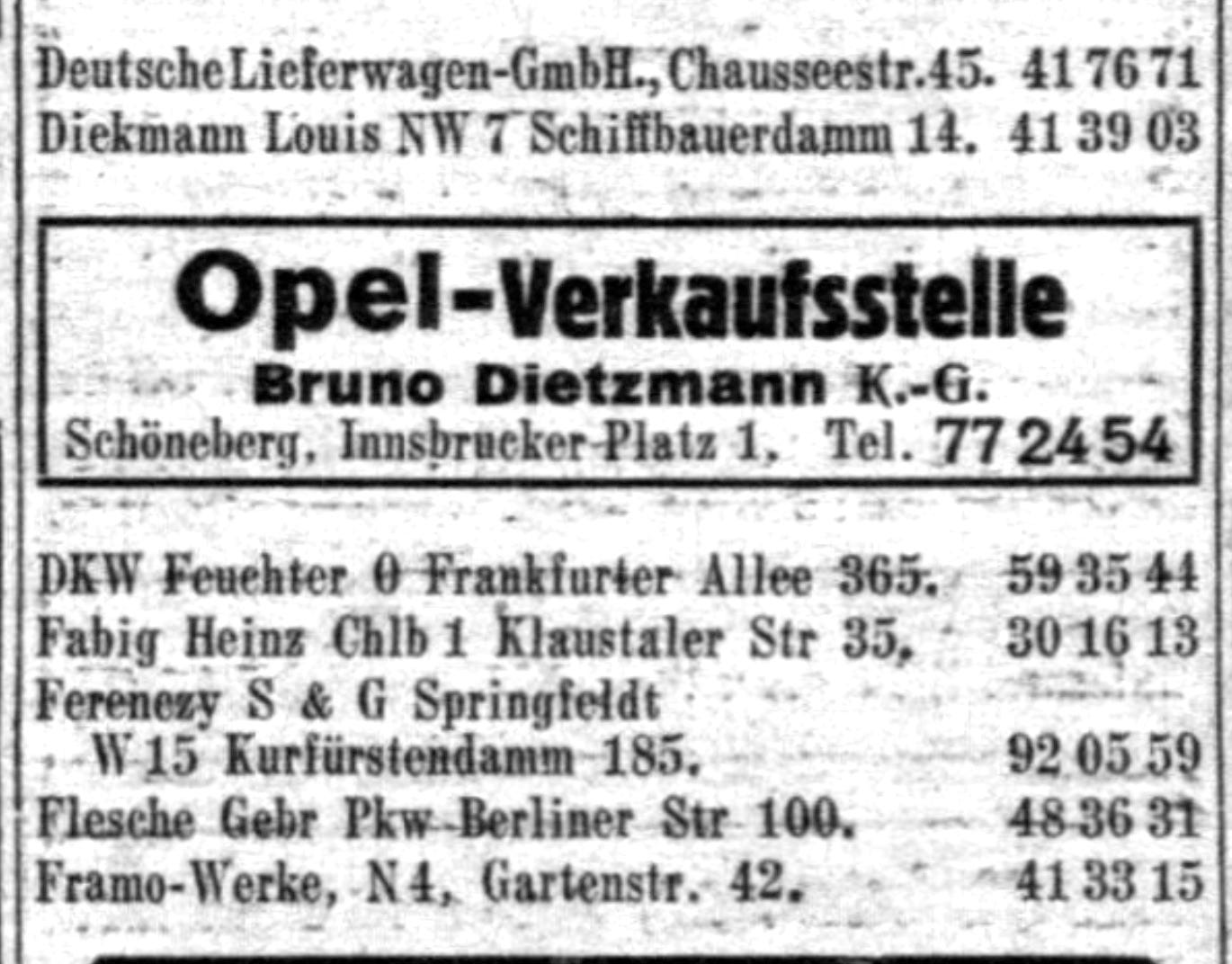 The 1940-edition of the Amtliches Fernsprechbuch für den Bezirk der Reichspostdirektion Berlin (the telephone directory) confirms Bruno Dietzmann’s car seller address during the war years.