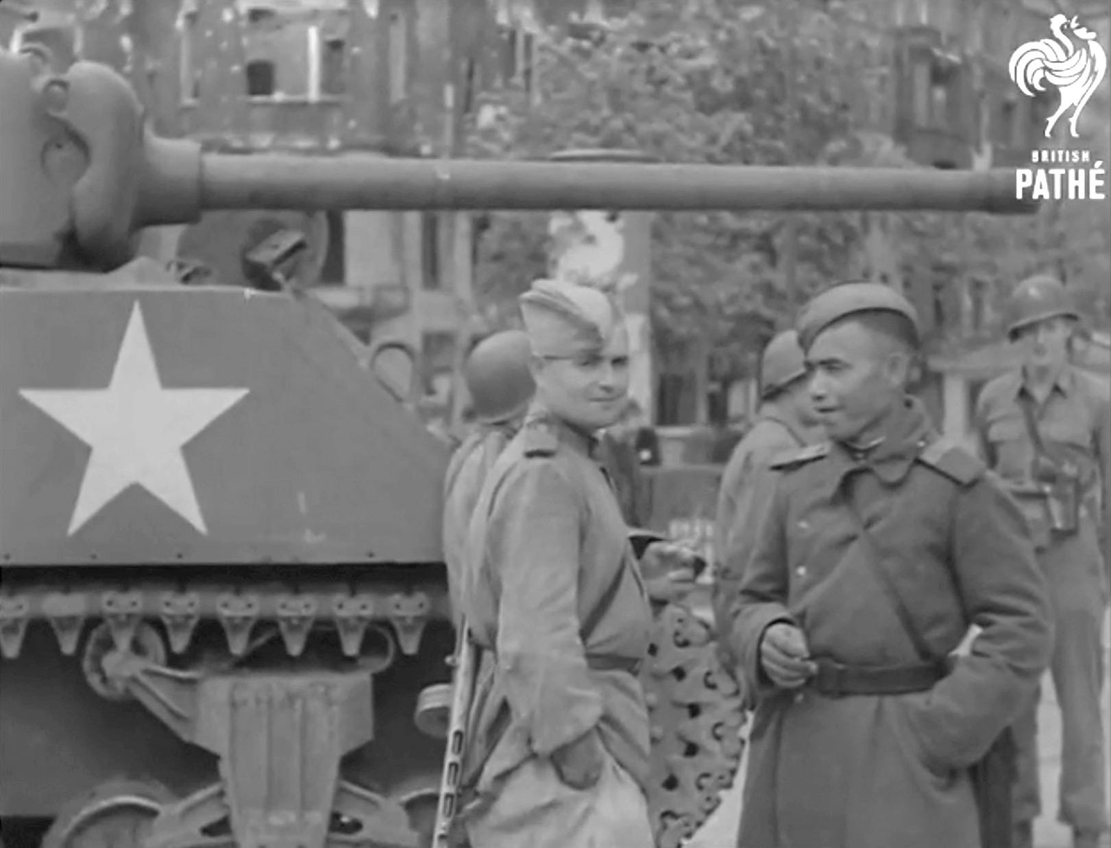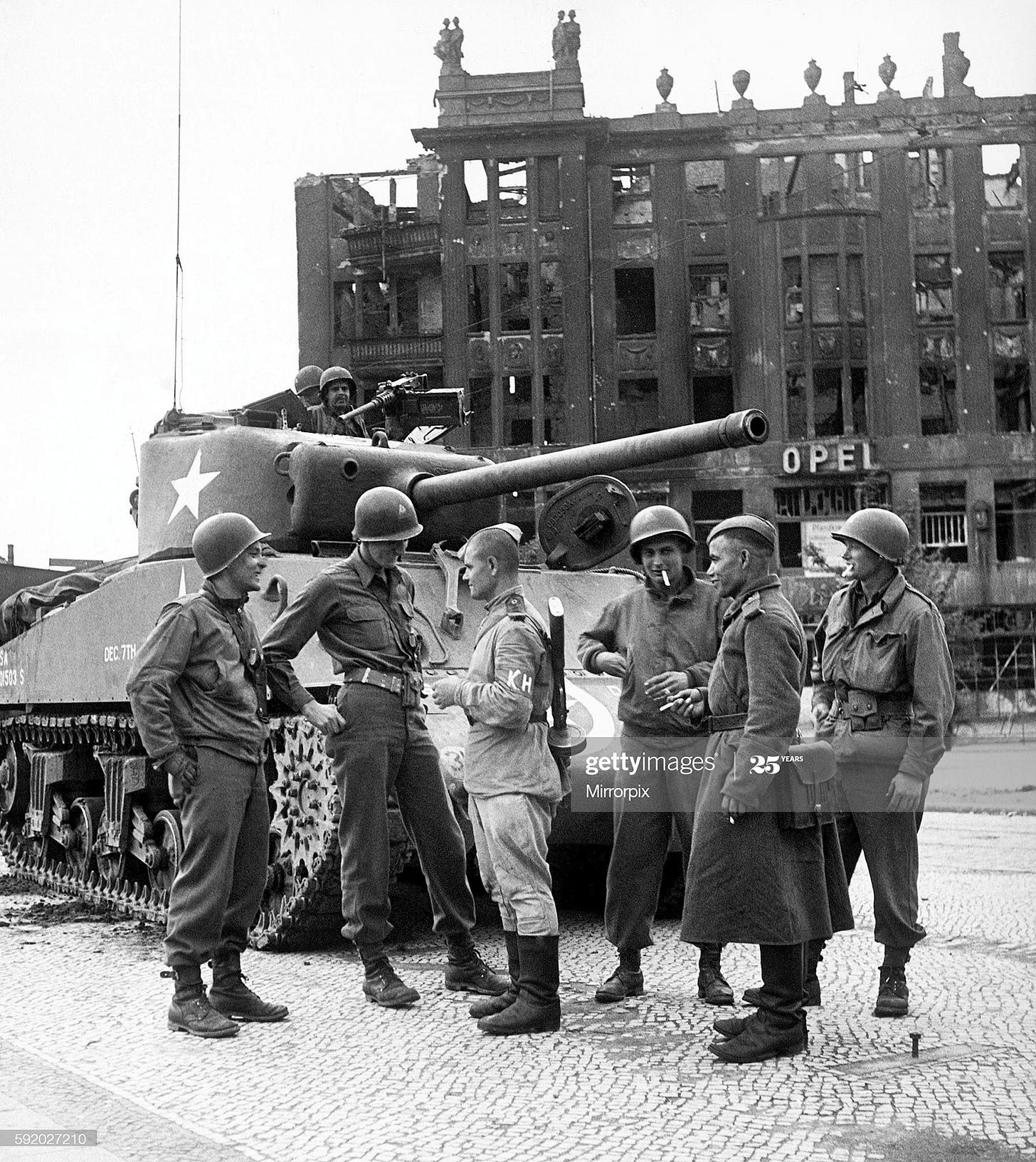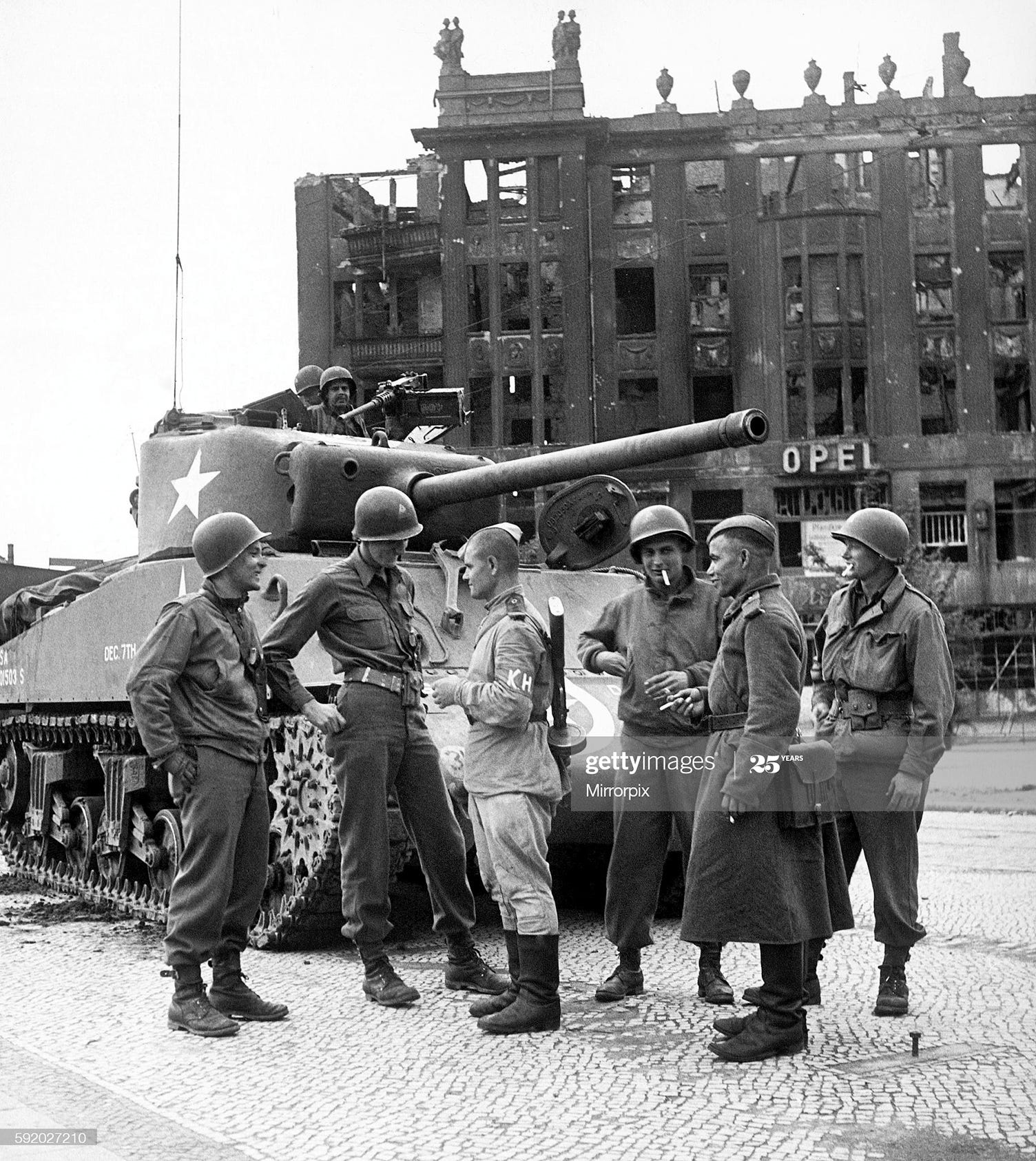Berlin, 1945 Nach Kriegsende: an American Sherman tank is parked in front of a S-Bahn station with a shattered apartment building and a destroyed tram stop background. Next to it, the tank’s crew stand in a relaxed pose and a few metres away a pair of Soviet soldiers enjoy a smoke and smile for the benefit of the camera.