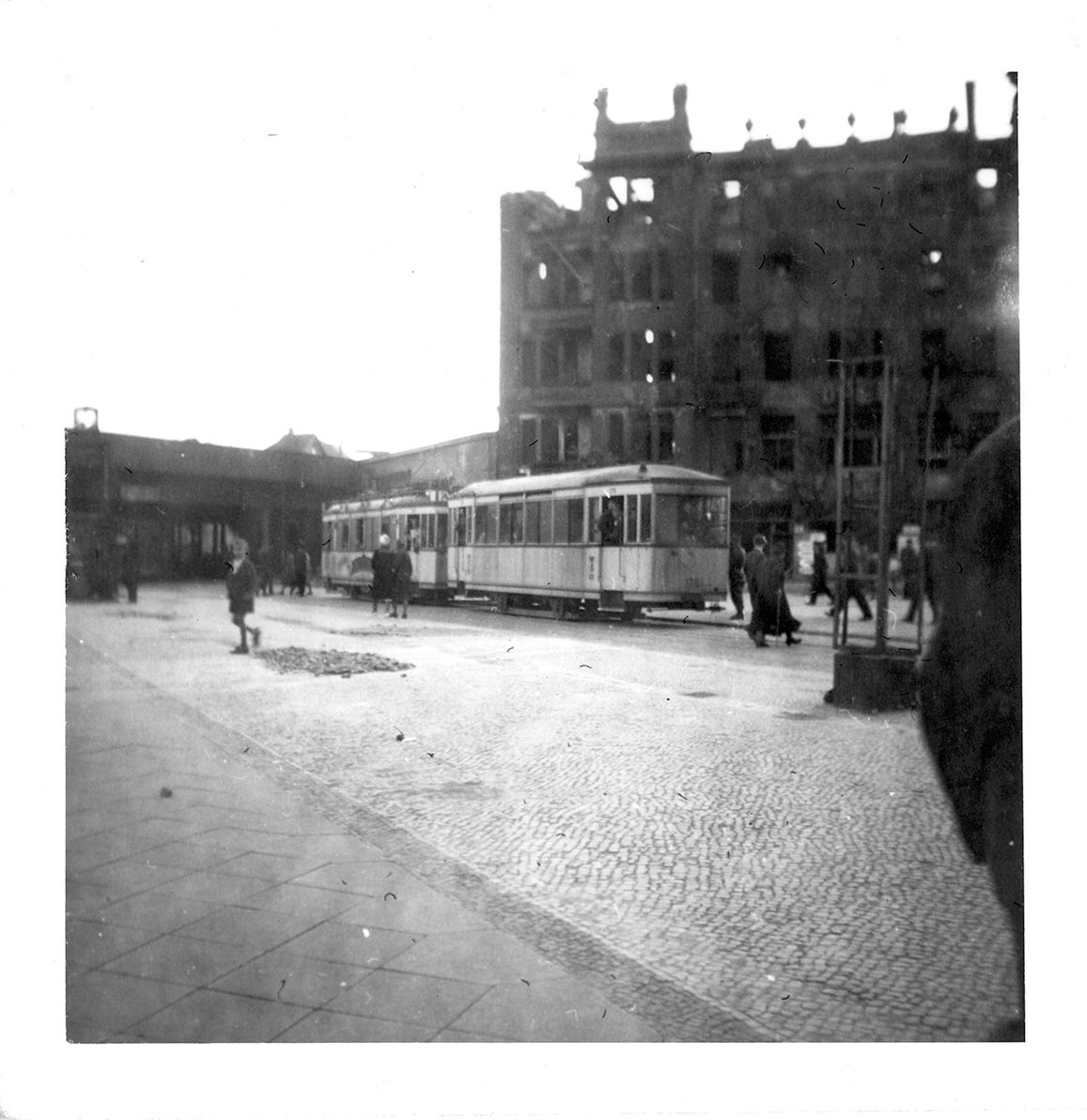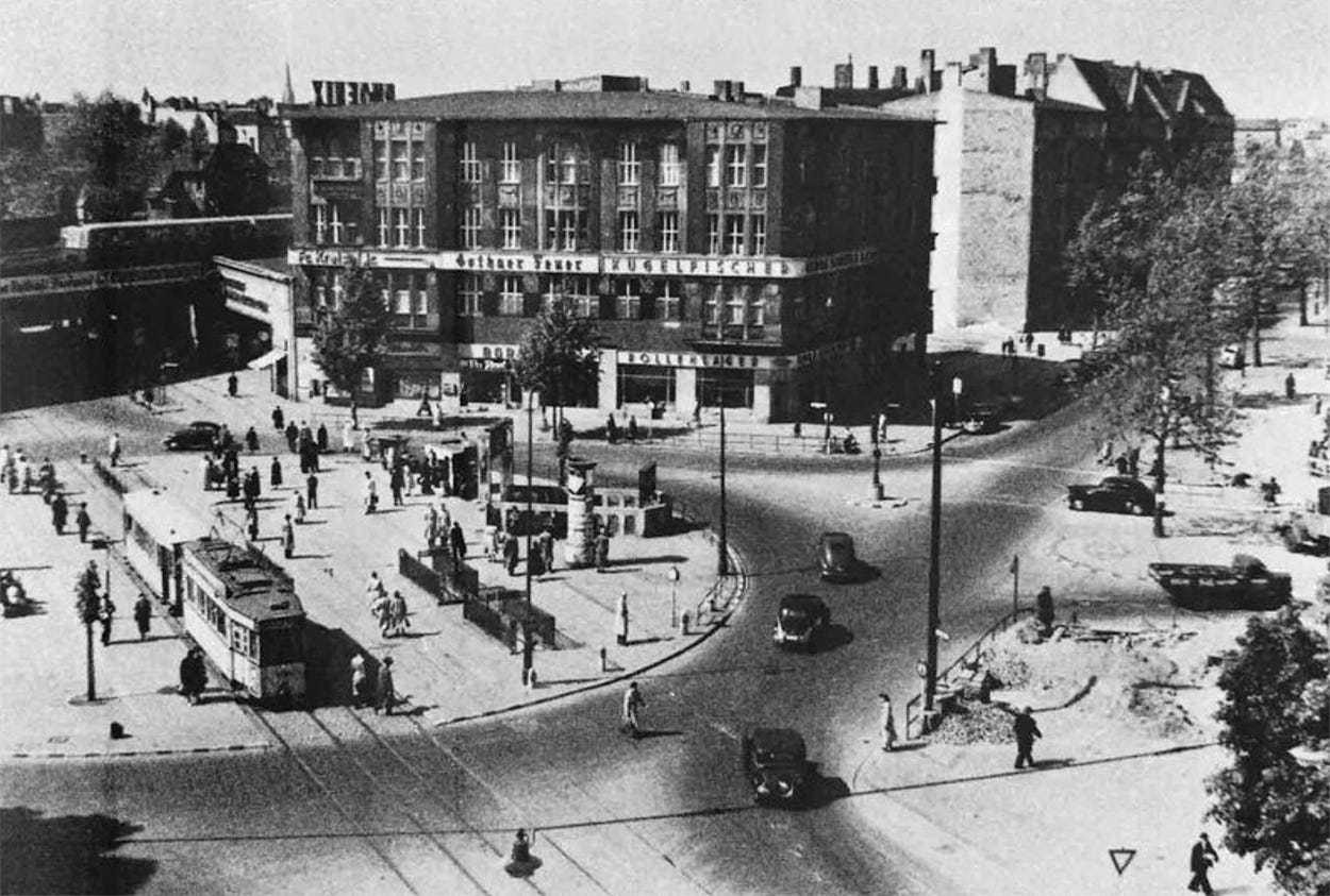 Innsbrucker Platz, once a heavily congested traffic junction back to life as soon as the first tram and S-Bahn lines went back into service at the end of May, as electricity was restored in all districts of Berlin by Soviet new administration, including the heavily bombed Schöneberg.