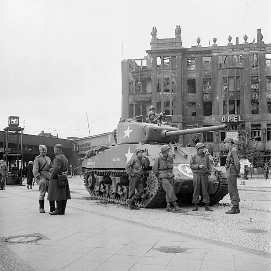 Berlin, July 1945: US Sherman tank at Innsbruker Platz