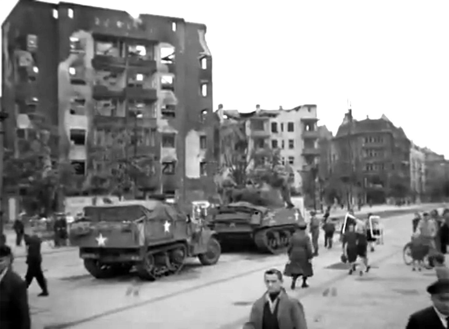 Film footage also reveals one of the most distinctive Berlin Weimar-era buildings that confirm us that this action was taken at Innsbrucker Platz: the DeGeWo-Hochhaus, badly damaged during the battle, with Hauptstraße at right as we can see in this frame of the same Sherman tank this time accompanied by a personal carrier M3A1 half-track, both parked in the middle of the square. The US military government (OMGUS) HQ building was not far from there, in Berlin-Dahlem.