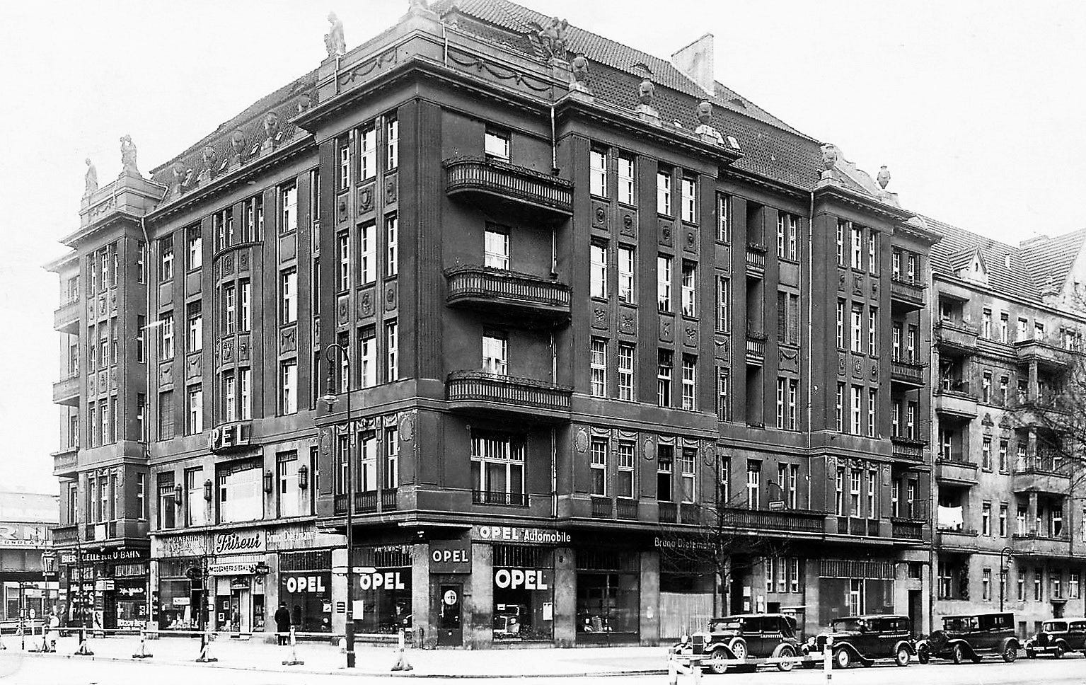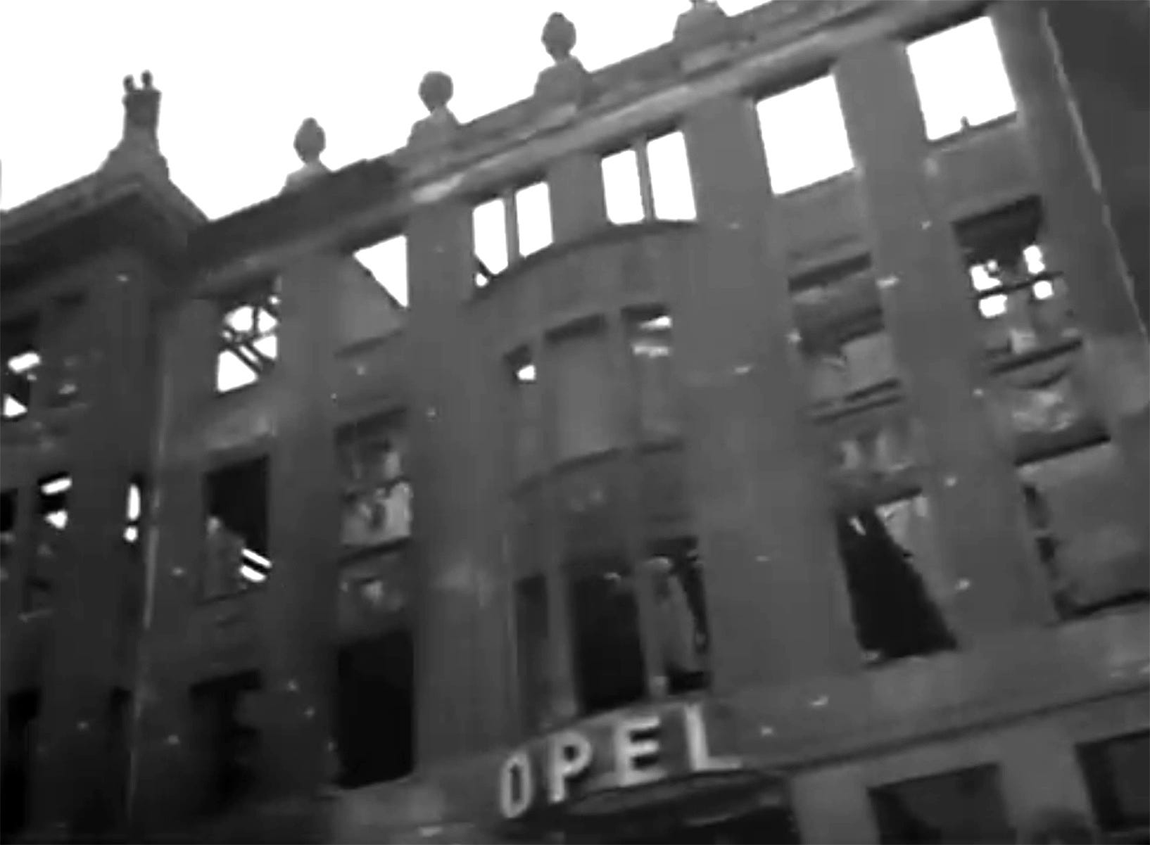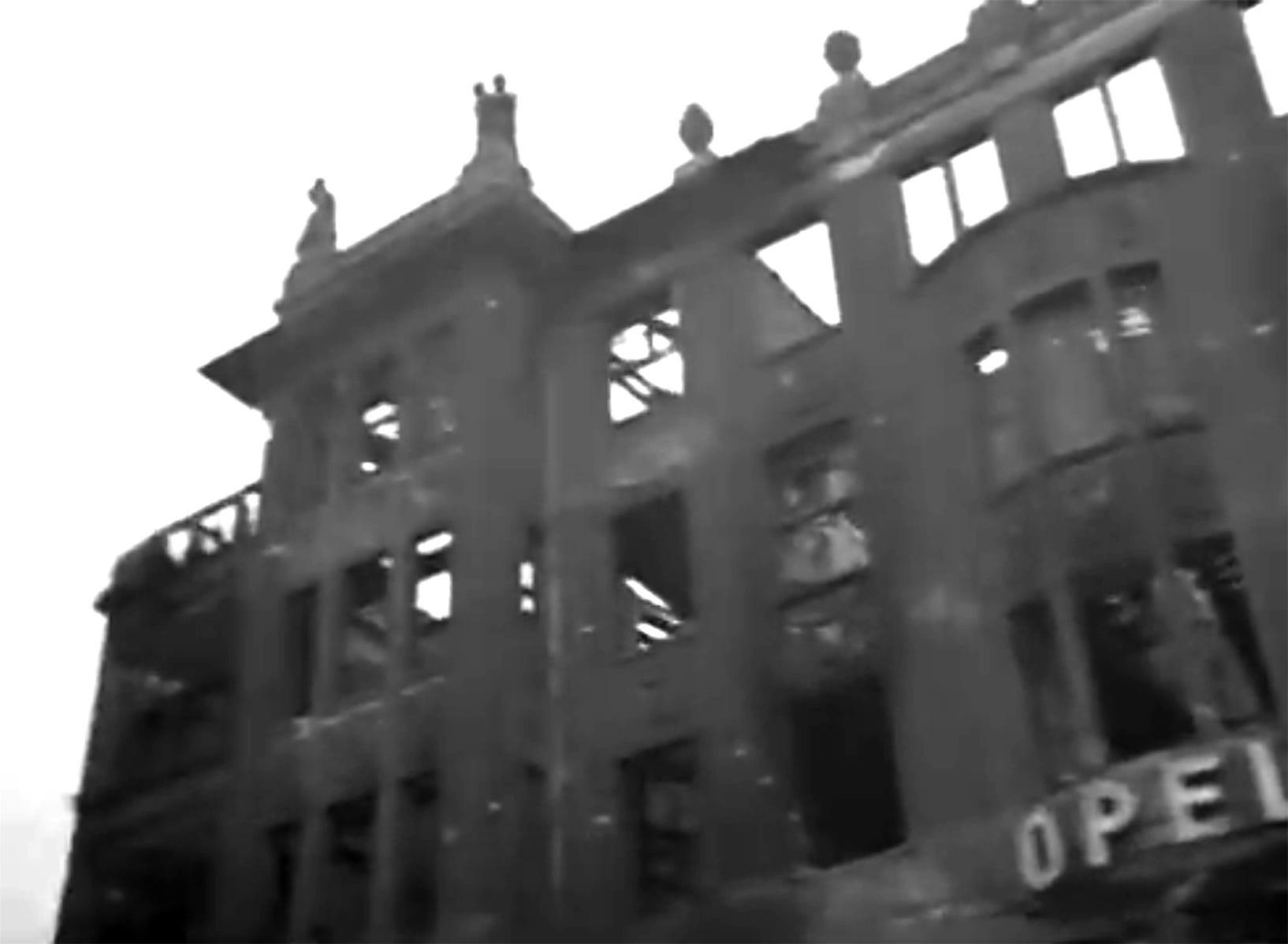Destroyed and burned out building seen in the background next to the train station and the Südringbrücke housed at the time a Opel-Automobile Verkaufsstelle G.m.b.H. (a car dealership) owned by Bruno Dietzmann on the ground floor and a Café at Innsbrucker Platz Nr 1. Compare it as seen here in 1935 with the next three pictures which show the gutted condition when the war comes to an end: only the skeleton and the facade have survived.
