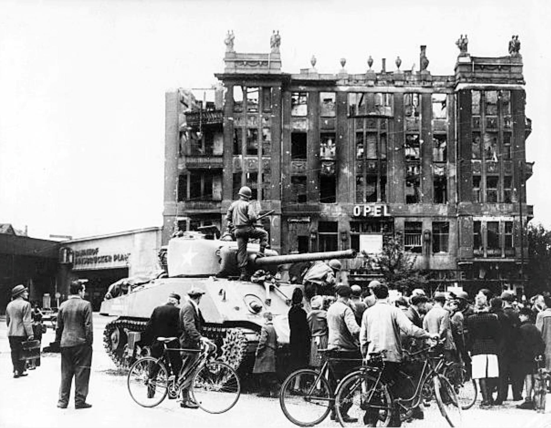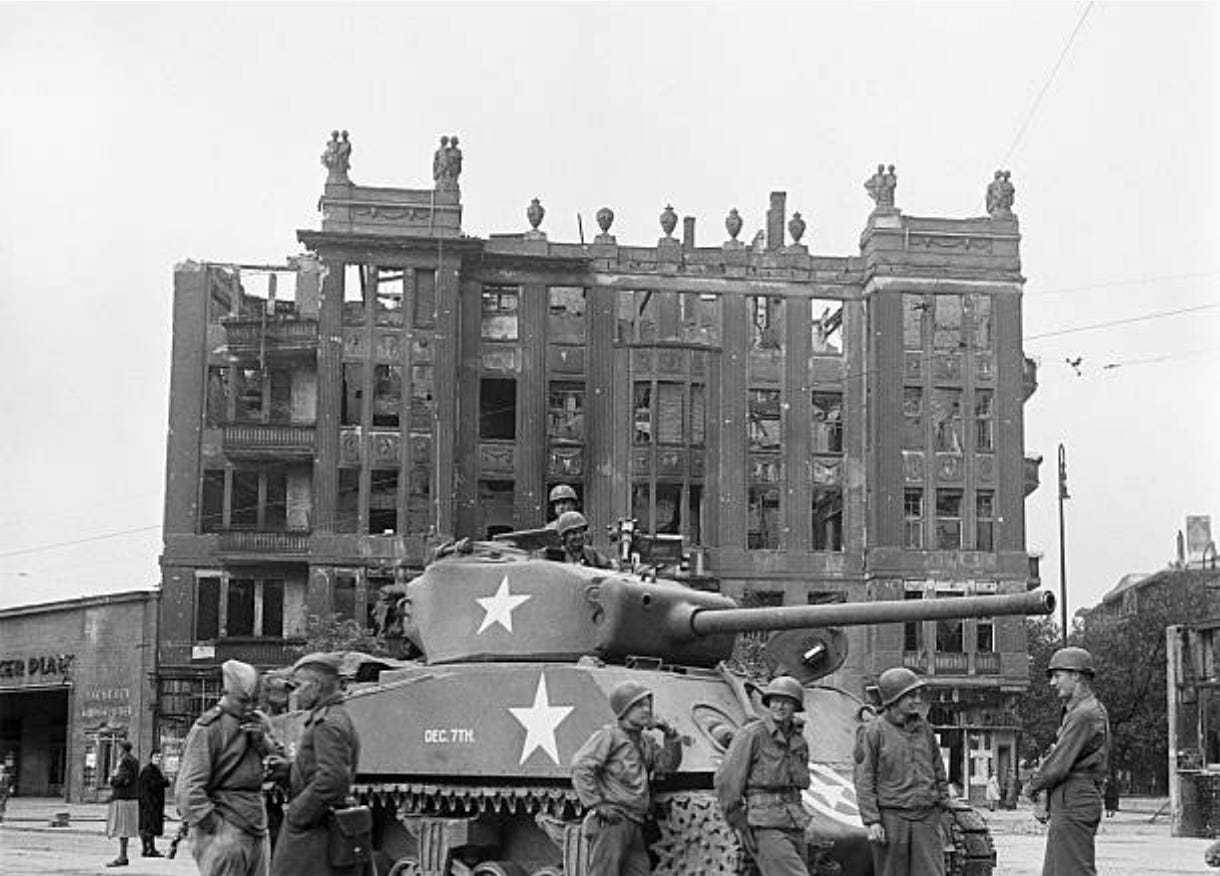 The scene must be captured when the first US tanks rolled into the streets of the defeated Nazi-capital at the end of the Second World War, entering Berlin from the southwest Autobahn to their planned zone of occupation. Transfer of power took place on July 4th afternoon but both forces coexisted at the area until 12 July when the Soviets finally left the American sector, so we can date the image between 5th to 12th of that month.