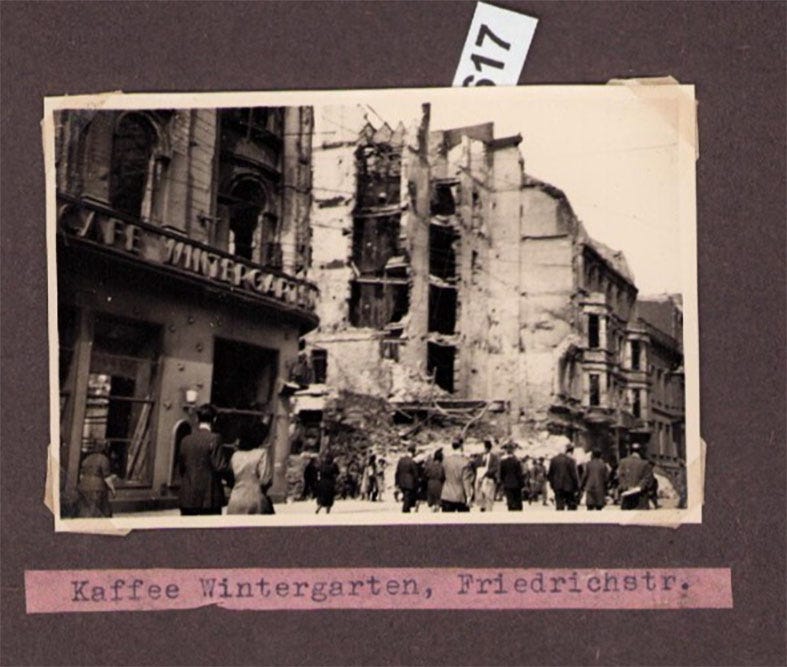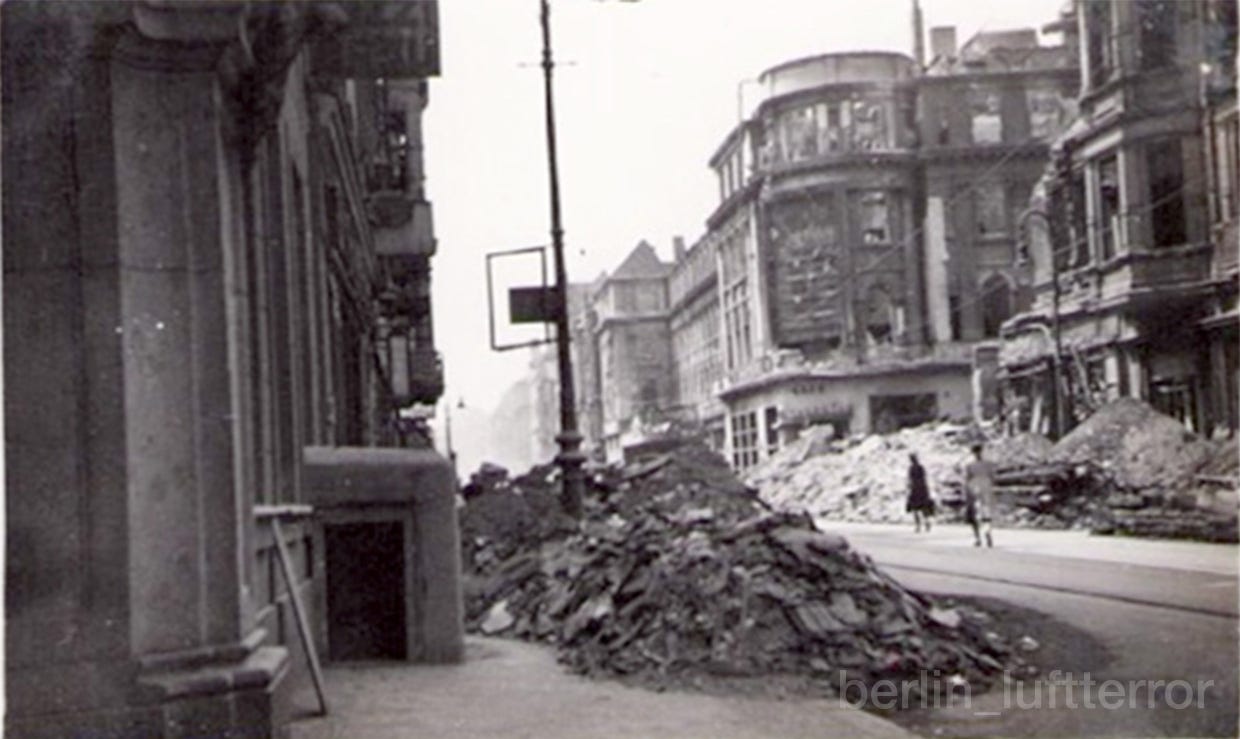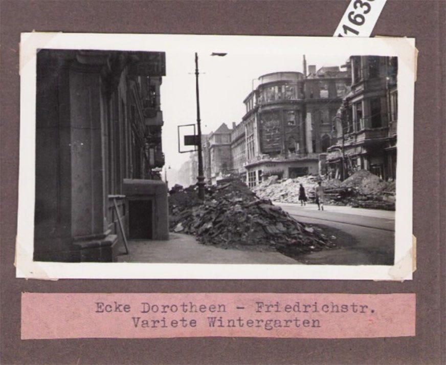 One of the most interesting pics which appeared on the last days is this one from a military albums seller (not a cheap one) labelled as “Ecke Dorothen - Friedrichstr. Variete-Wintergarten”, a 1944-view of ruined Friedrichstraße and the corner entrance of the Wintergarten-Central Hotel with both sides of the street covered with debris from the air raids. Picture seems to be taken from Dorotheenstraße, with camera looking west. You can read the Wintergarten’s (Friedrichstr Nr 143-149) full story, one of Berlin’s best-known variety theatres located in the heart of the city, here.
