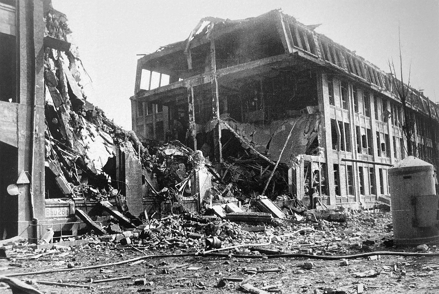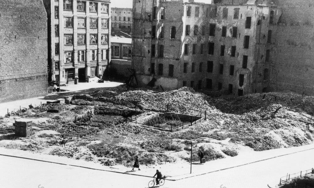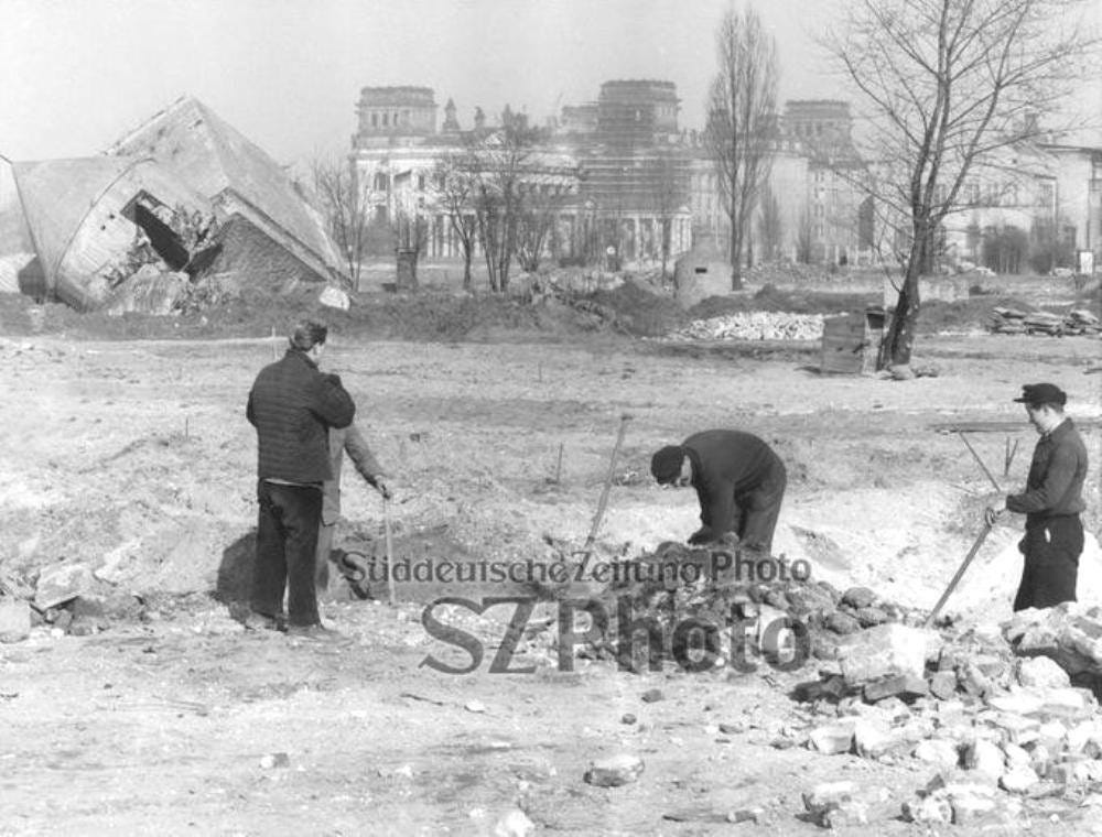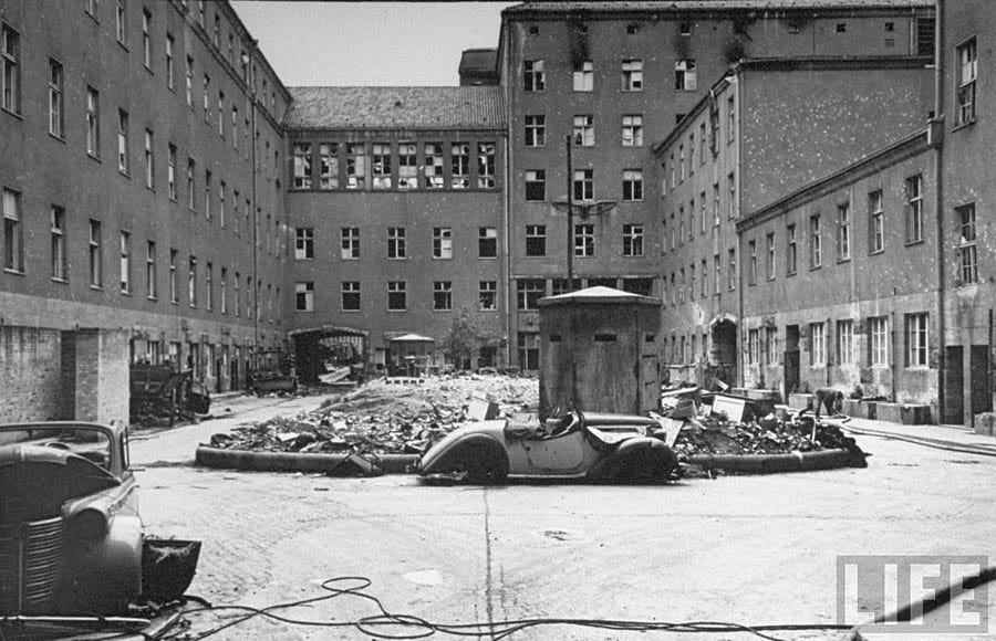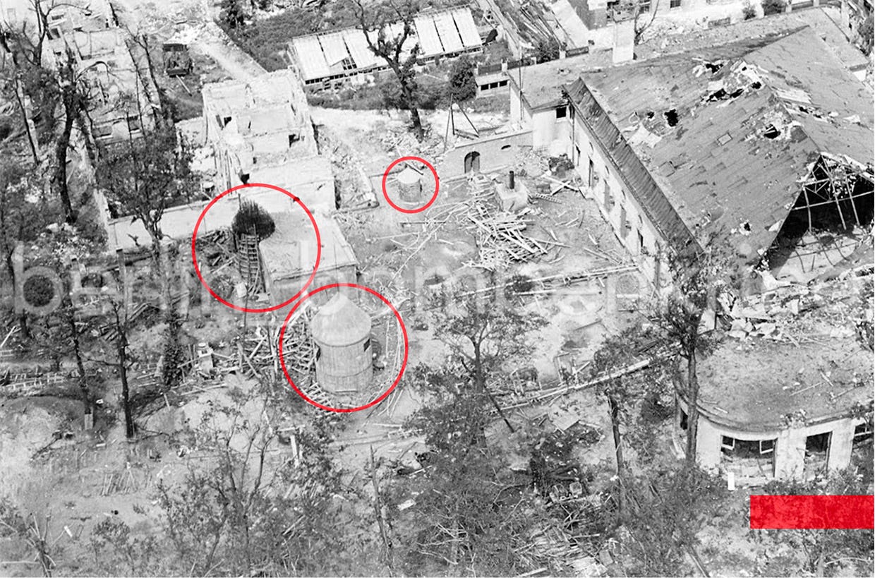 This aerial view taken in July 1945 by William Vandivert from LIFE magazine gives us an idea of the exact location of the SSZ pillbox next to Haus Kempka (the small one at centre) and the two huge ventilation towers/BWS at the Chancellery’s back garden.