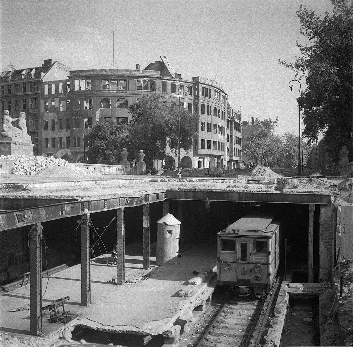 Taken after the war by Fritz Eschen in May 1946, the picture shows the ruined and devastated U-Bahnhof Stadtpark (today Rathaus Schöneberg) in Berlin-Schöneberg. The photographer was looking south to Innsbrucker Platz and the ruined Carl-Zuckmayer-Brücke is seen above, as a huge explosive bomb has exposed the U-bahn tunnels. Then located in the American occupation sector, this area and the nearer Bayerischer Platz were heavily hit in the war during the big US air-raid on February 26th, 1945. The city air bombing records reported that a big explosive bomb penetrated into the underground and blown up the roof of the U-Bhf station as the photo shows.