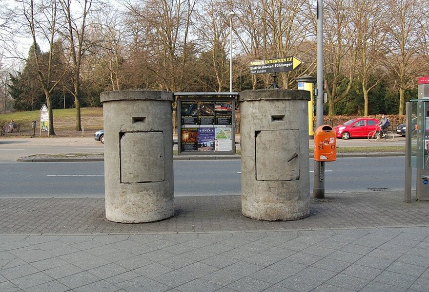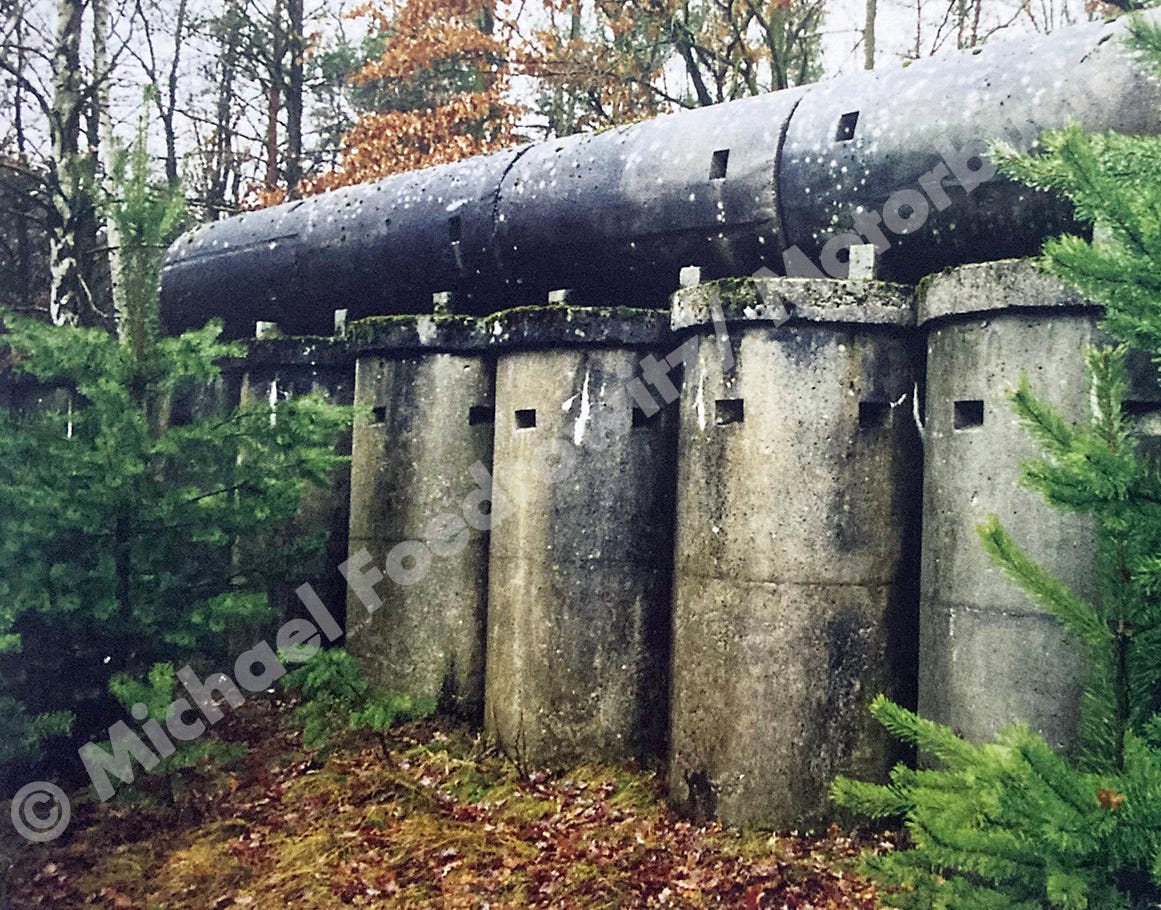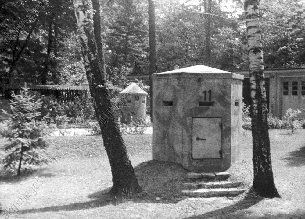 Far from the city centre, there is a Dywidag-BWS at Stubenrauchstraße in Berlin-Schöneweide and a Humerohr-type can be found at the Museum im Alten Wasserwerk in Köpenick, salvaged in 1994 from a pit in the Johannistal Wasserwerk. In Reinickendorf there is another SSZ too inside a private garden. Other similar structures are found at the Werneuchen- and Staaken Flugplatzes and at Hennigsdorf. At the Polizei training area in Spandau there are over a hundred SSZs housed, which may come from the same manufacturer (this is probably a former assembly point in the British military administration), and several others in the woods of the Forts Hahneberg. Finally, if you walk into the abandoned Olympisches Dorf, 14 km west of the Olympic Stadium, you could see another pair of BWS, this time of hexagon-shape that were used by Wehrmacht guards that watched the villa. There are many others left in the Brandenburg area.