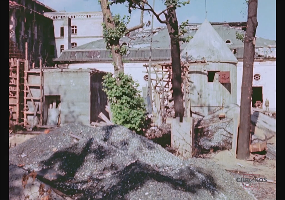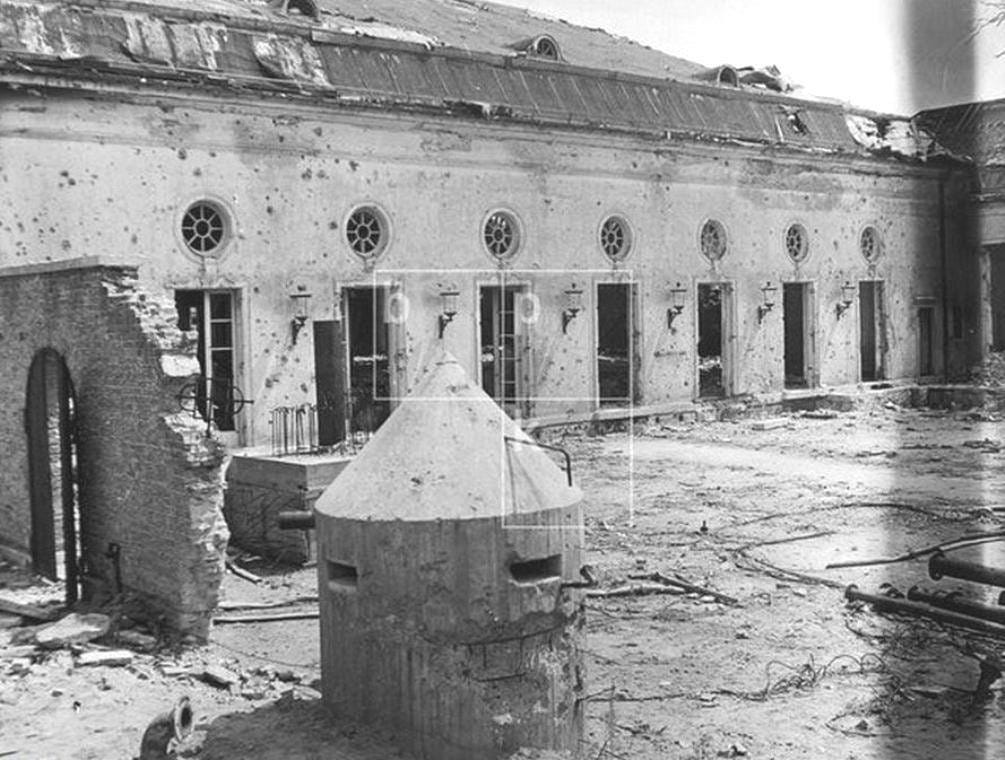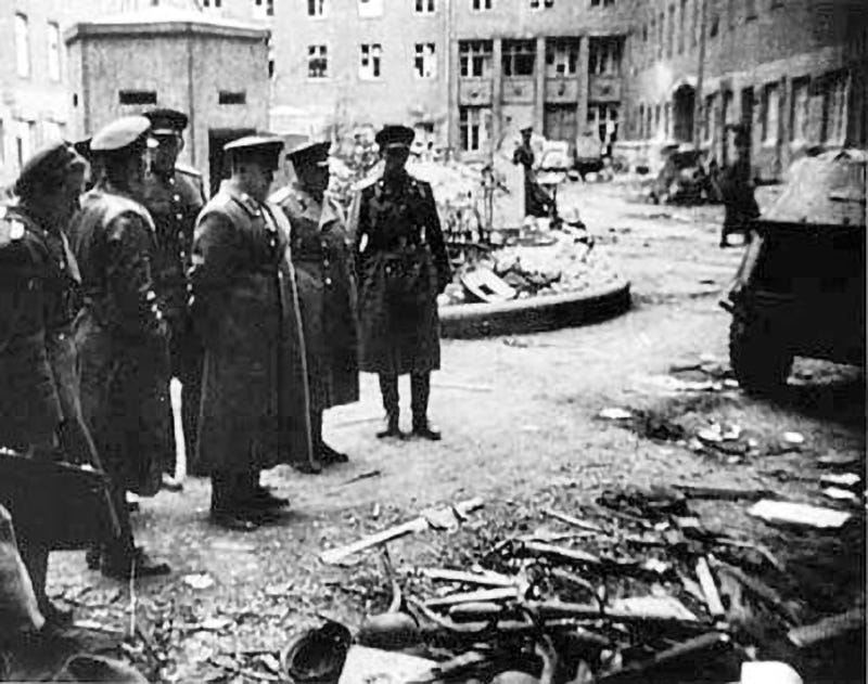 Here Marshal Georgi K Zhukov, the Soviet commander, inspects debris from the battle inside the court during his tour to the defeated Nazi-capital in July 1945. One of the two BWS is seen behind him and his visiting party.