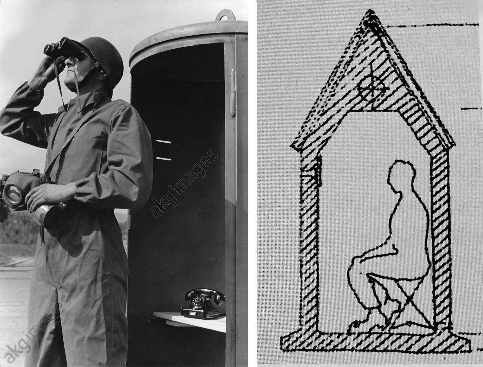 Also, the Nazi Reichsluftschutzbund (RLB) created in 1934 the civilian Luftschutz fire-warden figure against the air-raids, to lead people to the shelters and took a first account of fires and explosions. He would also provide information about the location of ‘duds’ and artifacts that have not yet exploded. And the BWS was his shelter. Some were equipped with a telephone and electric light, to allow the fire warden to pass on his observations to the command post. It also covered the guard from strafing attacks from enemy aircraft.