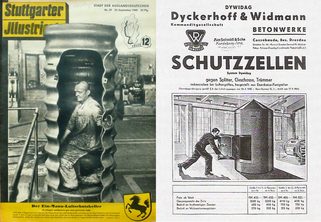 At first, manufacturing companies offered these shelters made of steel with ballistic protection (Metallzellen), but when the war started that was a raw material and so much needed for the war effort that had to switch to using stamped concrete (Betonzellen). Some types used bricks but were rare. The German concrete industry manufactured them in many variants with some minor differences comprising different shape or number of access hatches and viewing slits. Well-known manufacturers of SSZ were DYWIDAG (Dyckerhoff & Widmann) in Dresden, Leonhard Moll Betonwerke in München, Mannesmann, or Westermann & Co. Also by two Berlin-based companies: Dietelgesellschaft mbH at Charlottenburg and Joseph Lang in Berlin-Wilmersdorf. The exact number built during the war years is unknown but ten of thousands were installed across the German Reich soil and the occupied countries, the majority set up by Organisation Todt.