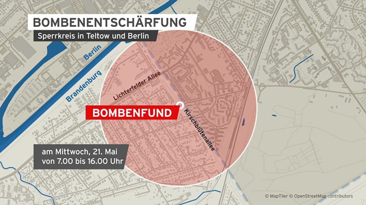 A 600-meter exclusion zone around the site was established for the defusing work by Polizei authorities starting Wednesday early morning for safety reasons. More than 5,500 people had to leave their homes yesterday morning in the Berlin Steglitz-Zehlendorf district and Teltow before the defusing work started (3,800 and 1850 respectively.) The exclusion zone has already been reopened without incident.