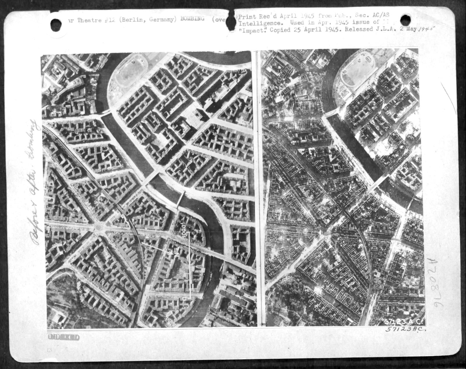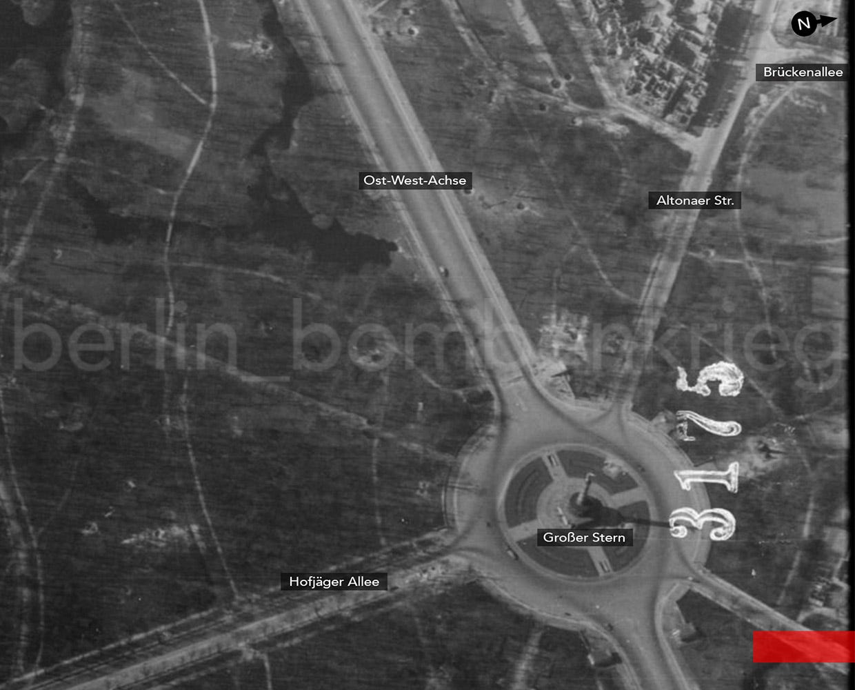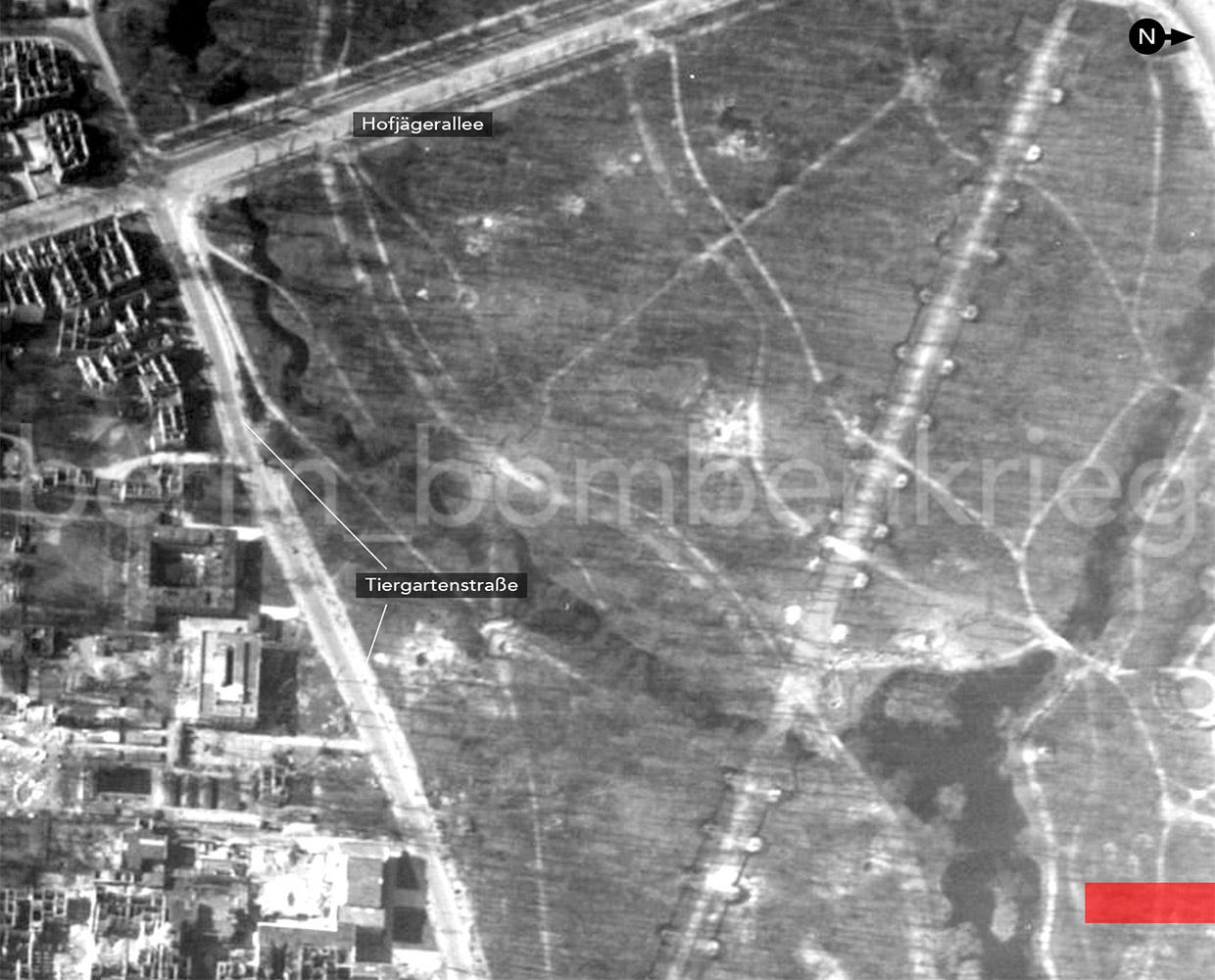 Again, we turn to Allied aerial reconnaissance looking for photographic evidence of the wanted location. On March 22nd, 1945, an F-5 Lightning of the 22nd Photographic Reconnaissance Squadron, USAAF, flew a long photo run over Berlin to assets bomb damage (Sortie US7-40D) after the big US air-raid made on the city four days before.