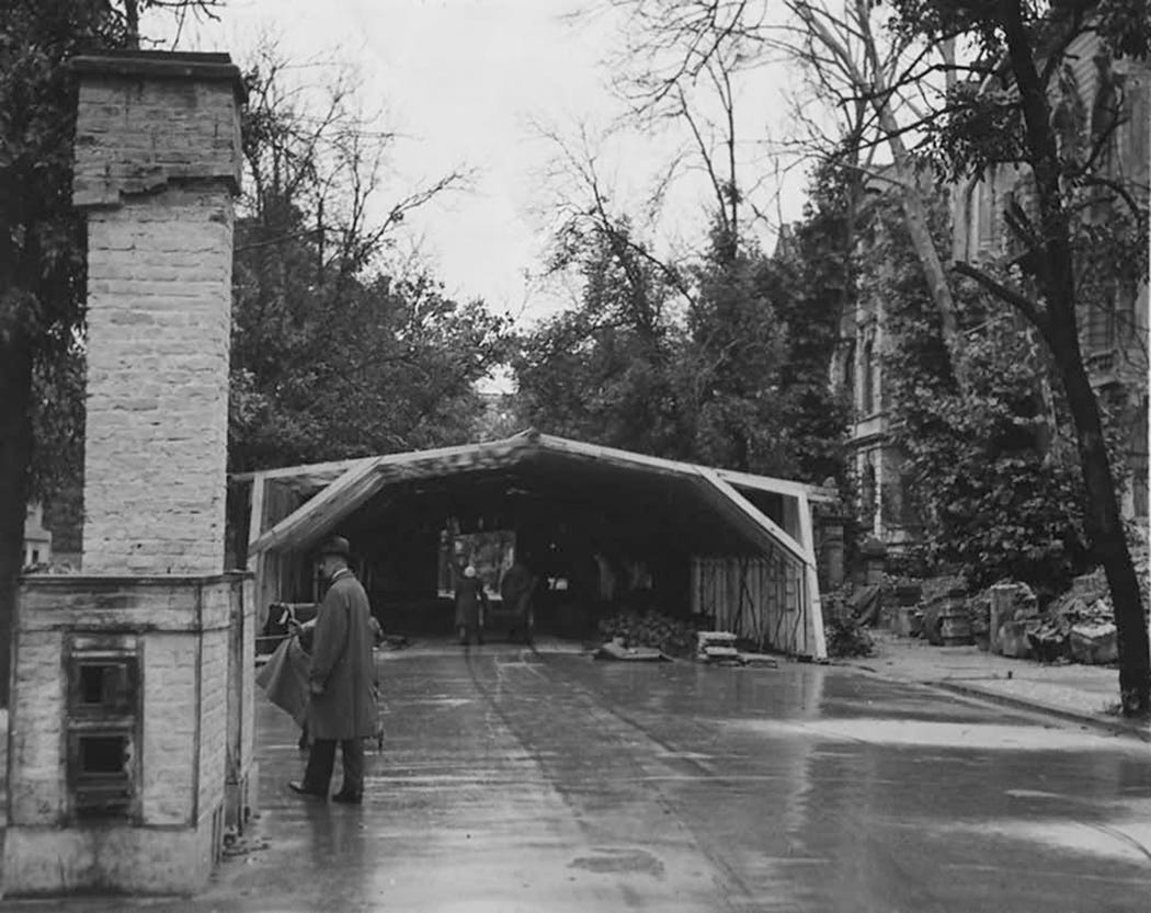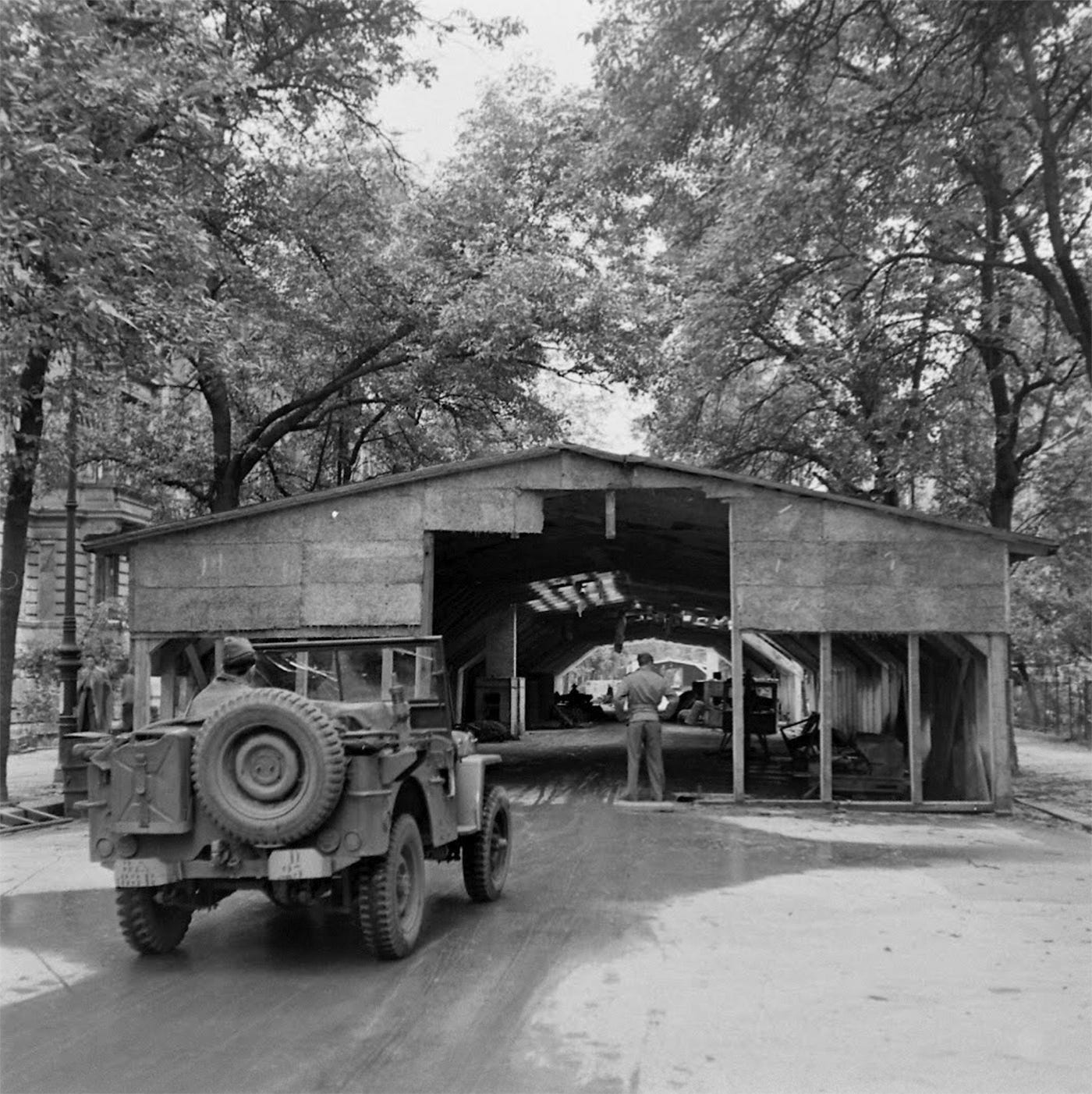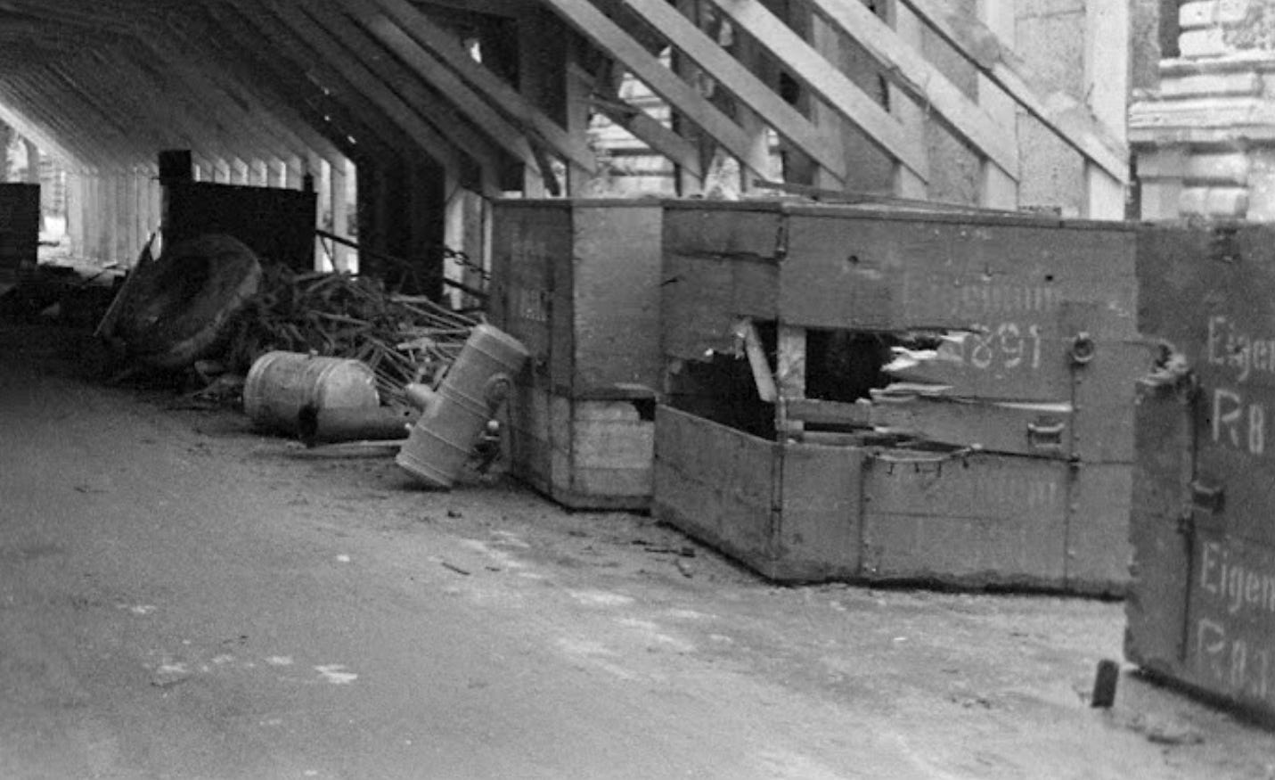 During his trip across the Tiergarten sector he found a pair of strange structures: two large hangar-style wooden halls built right on a wide street in what seems to be some kind of makeshift German depot or repair facility. In the pictures can be seen that their walls were covered by cork plates and the roof by fabric trying to camouflage it from the air; residential buildings with fancy facades are seen on both sides with the place left in an abandoned condition.