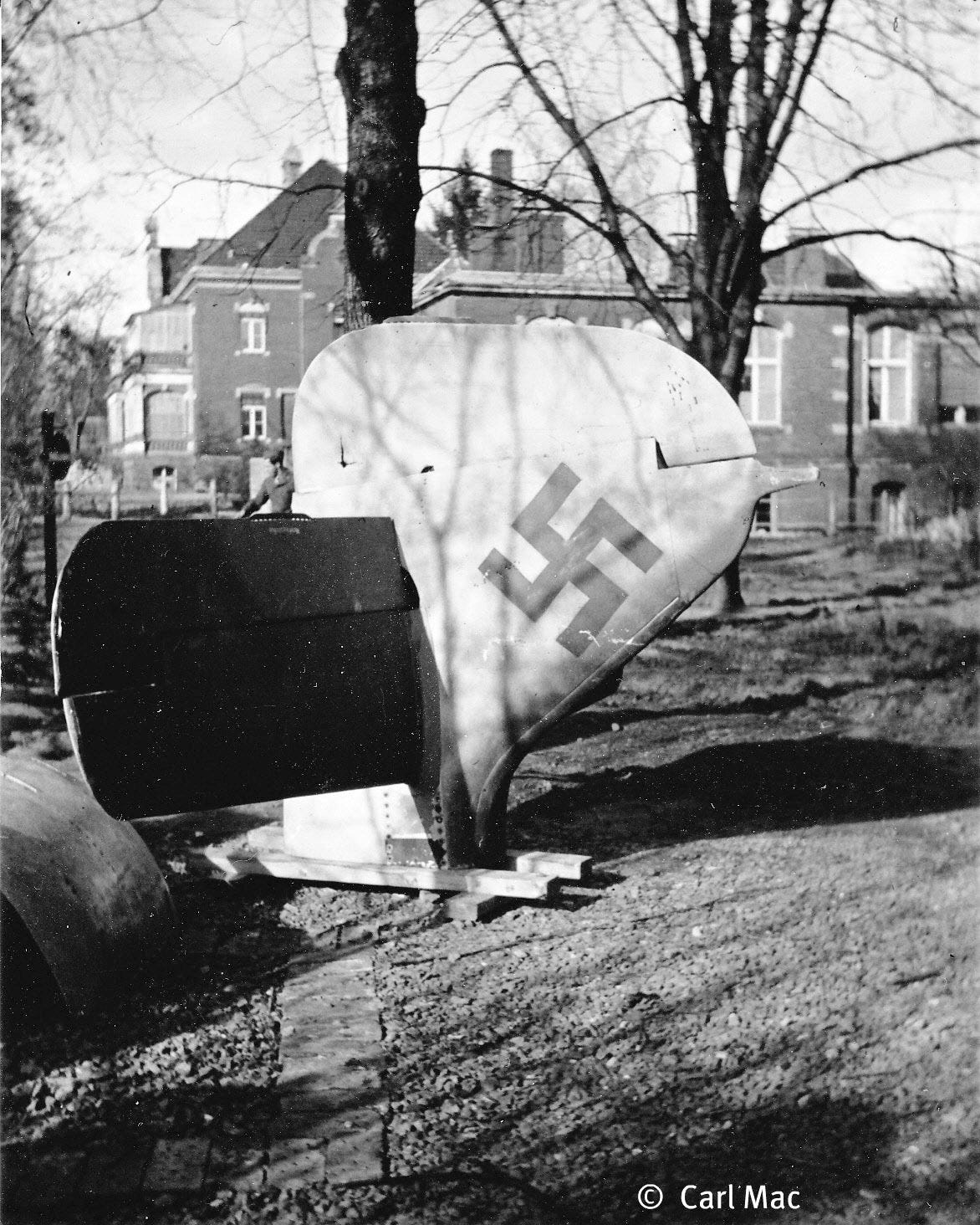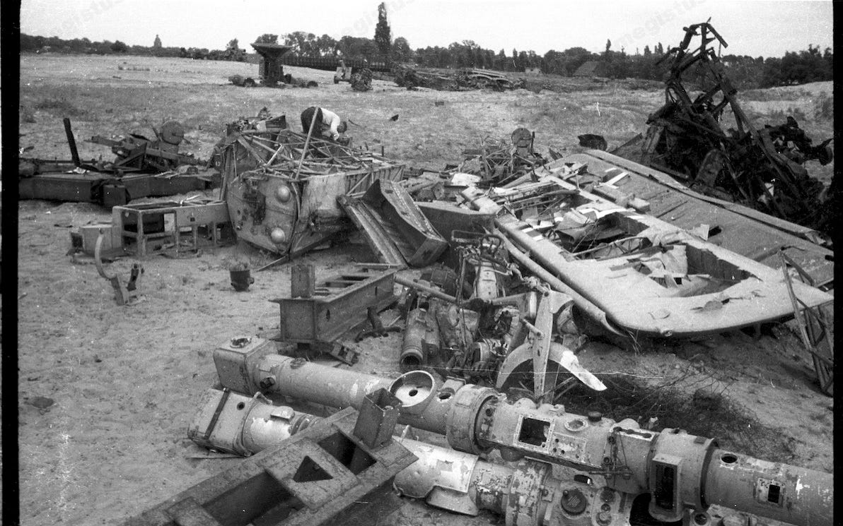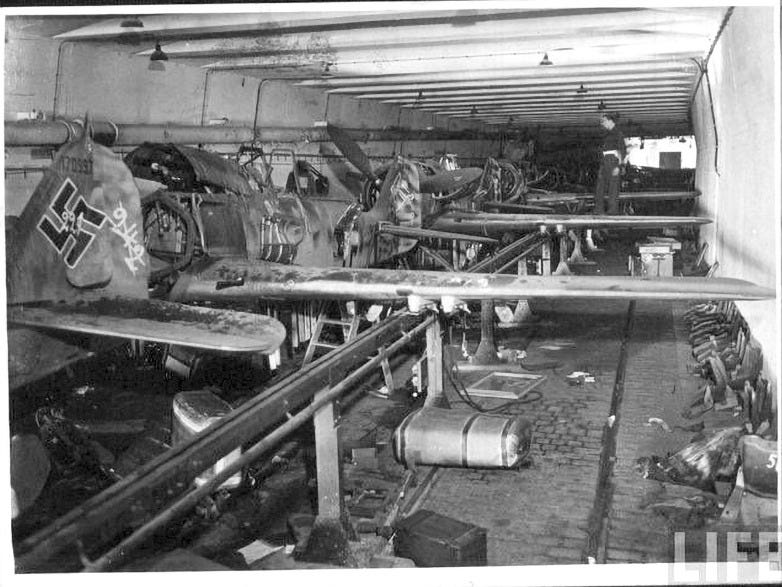 Another evidence of the existence of improvised aircraft depots used by the Germans during the last months of the war could be this picture taken in summer of 1945 by an American serviceman during his duty in the occupied city. It shows the tail section of a Focke-Wulf Fw 190 ready to be assembled into the airframe. Note the factory-style wooden platform beneath, which confirms it as a sub-assembly part from a depot and not a wreck from a destroyed fighter, and the engine panel next to it.