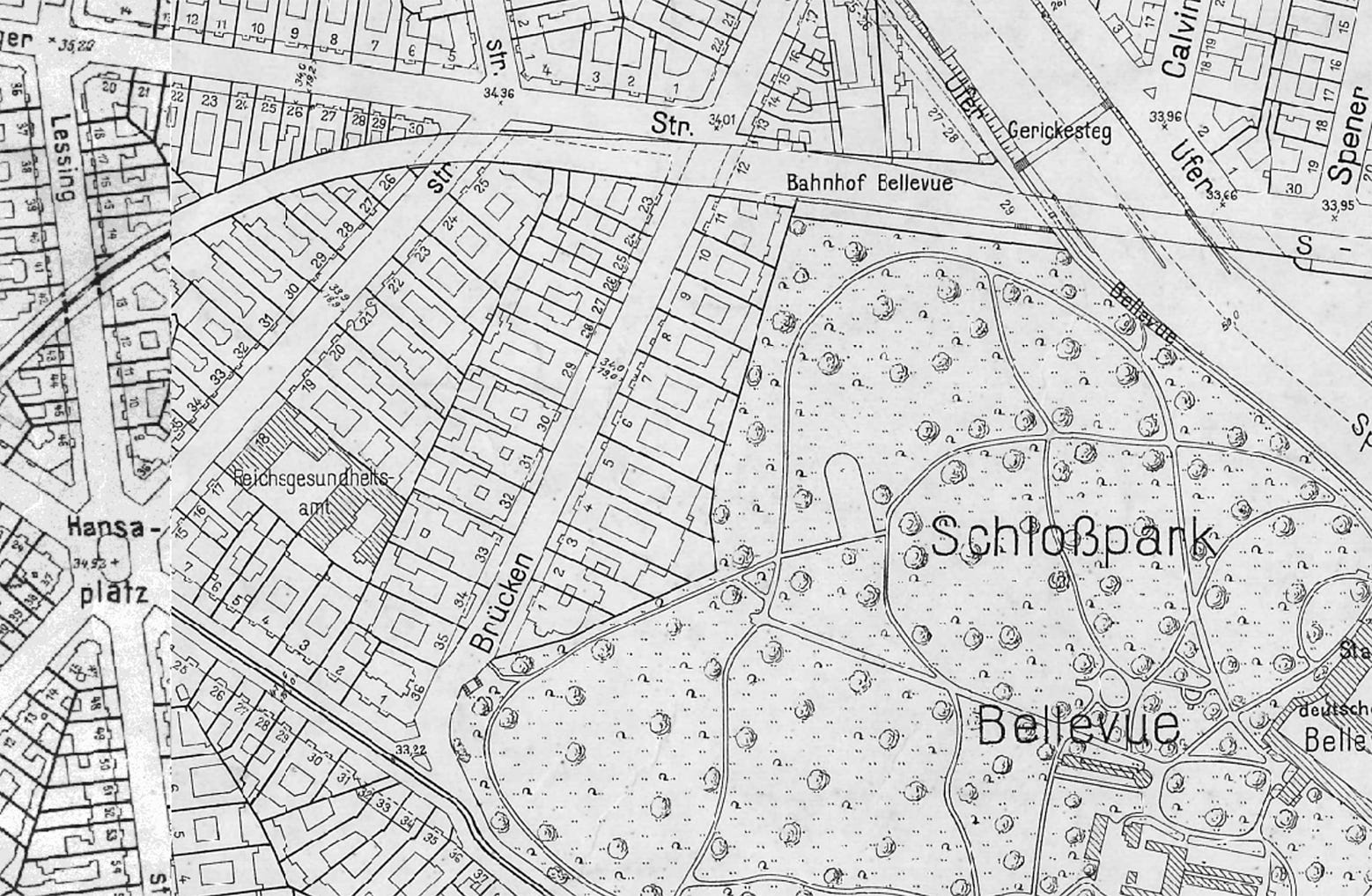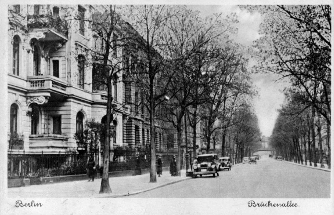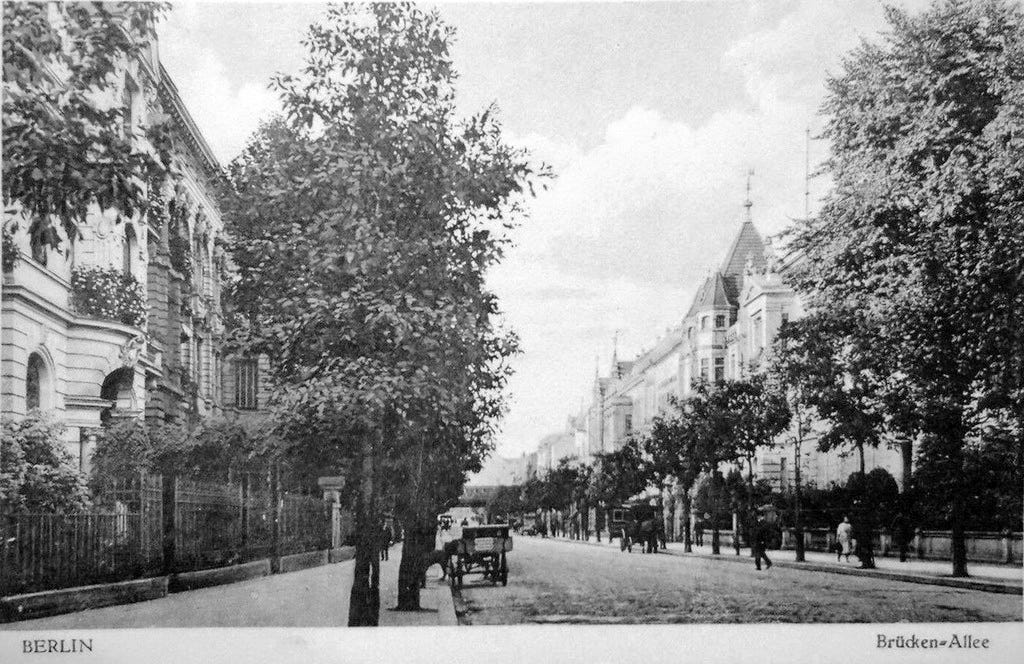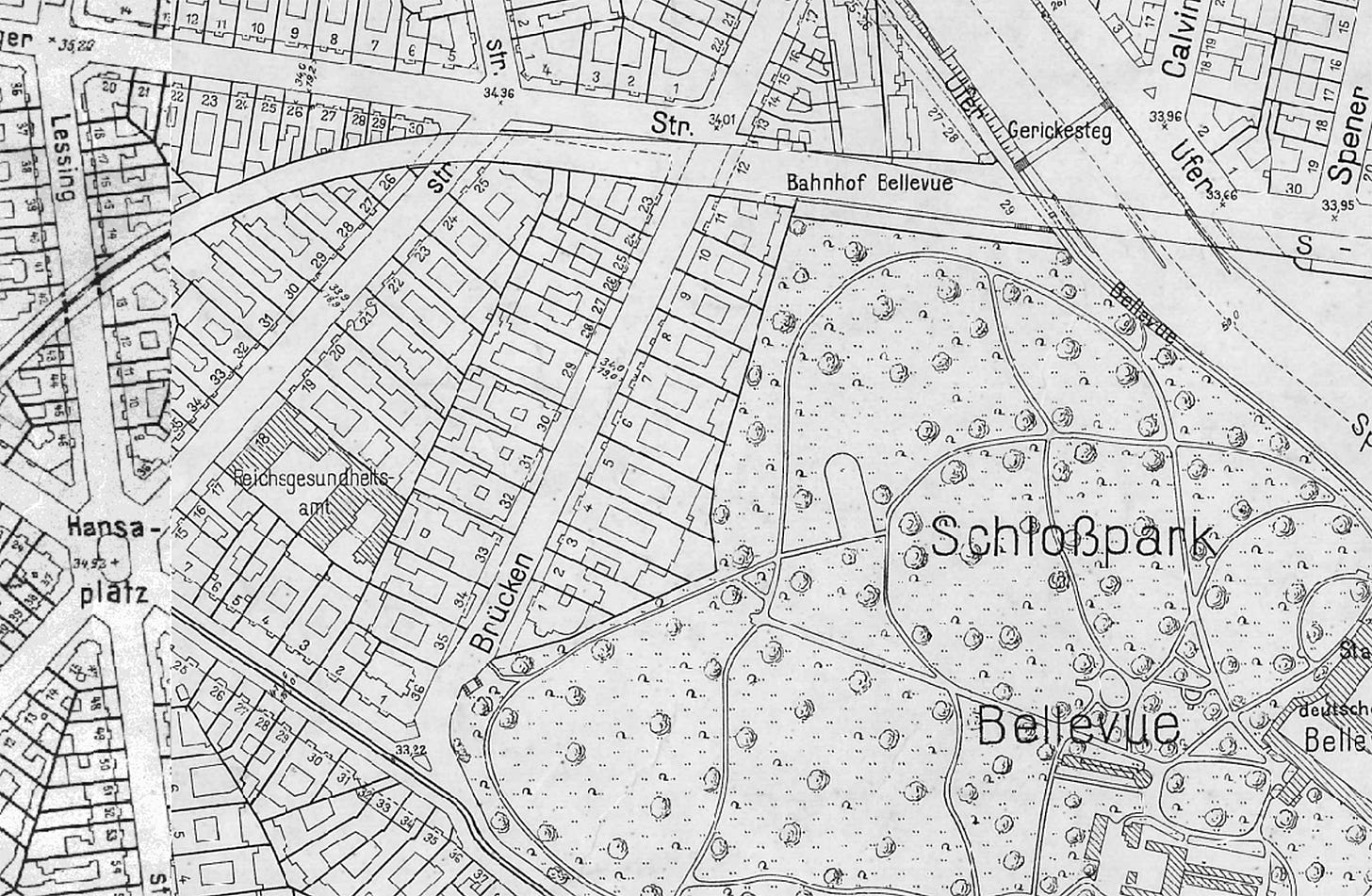 Located in the northwestern Tiergarten, Brückenallee was part of the residential Hansaviertel district that emerged from the intersection of three main streets in the Hansaplatz square. Sadly, there is no chance to examine the place today: huge devastation caused by the war and the air bombings led to a massive rebuilt of the area in the post-war years, with a reconstruction urban planning from 1953. The modern West-Berlin urban quarter developed and simplified the area and some streets like Brückenallee or Lessingstraße were removed from the map, although part of its track became today’s Bartningallee.
