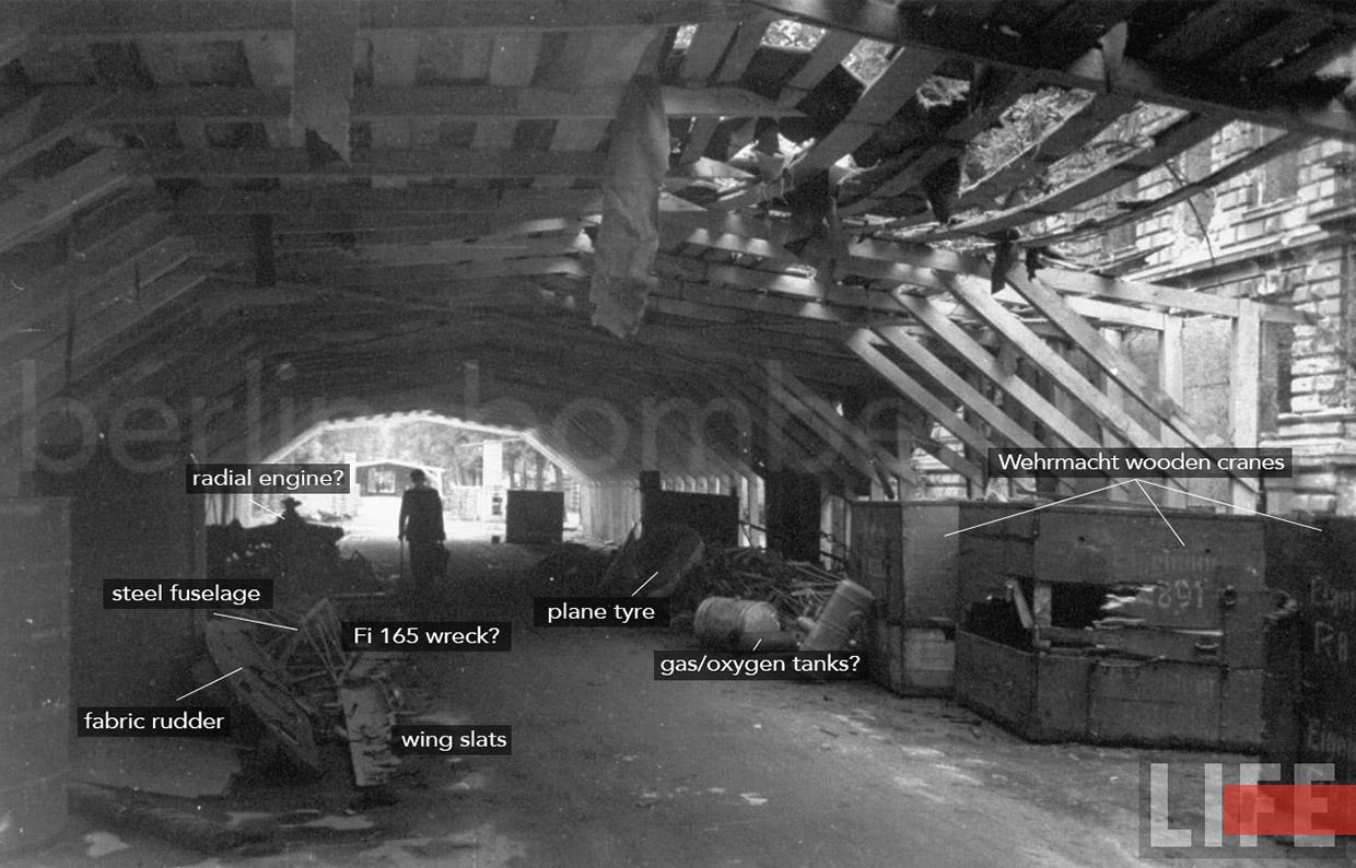 The vast majority were large size structures built next to or around an aerodrome or small aircraft sub-assembly factory, especially after the bombing campaign forced the Germans to disperse their aircraft industry, but there are examples of small and rudimentary facilities near the battlefronts, especially in the Eastern front. What makes this facility unique is its location in the middle of the city, furthermore in the Reich’s capital. The Berlin defenders may have used this depot to engine overhauls, small repairs or servicing the intended visiting aircraft as it was planned by the Nazi leaders.