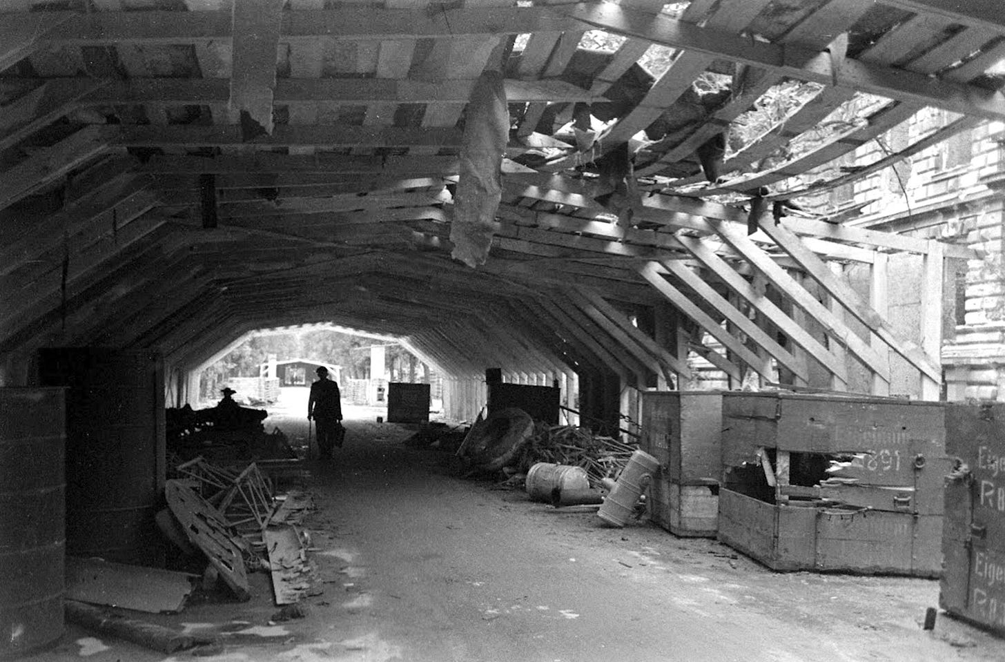 Vandivert took this picture of the second hall also, looking apparently northwards and with the first one and the stoves seen in the far background (there were some others between the two halls). This one seems to have a complete opening at both ends unlike the other and within it we can see a wide variety of objects (aircraft wrecks?), some huge wooden crates and debris everywhere. Both facilities appear to be damaged or left unfinished, with part of the roof collapsed and its fabric cover torn.