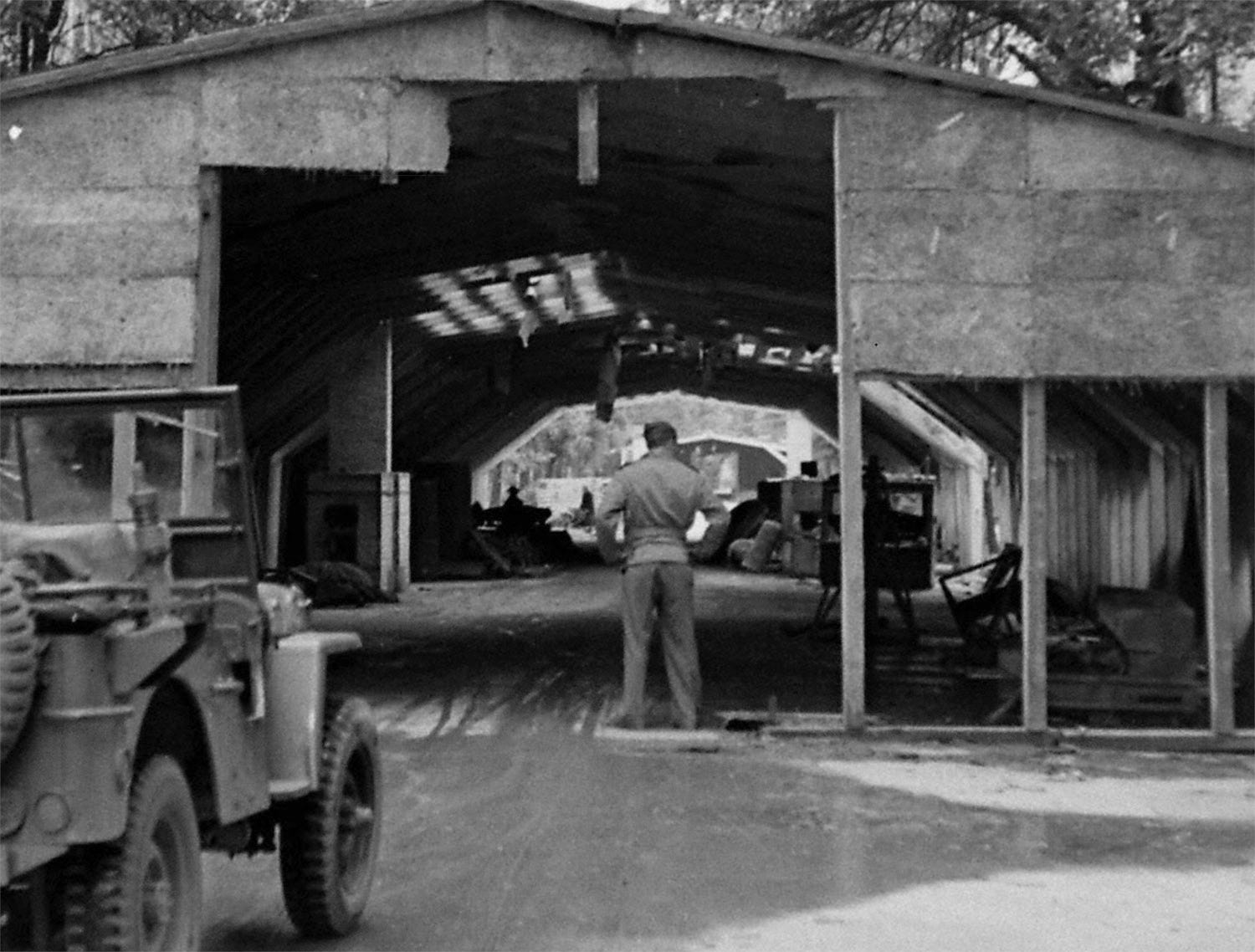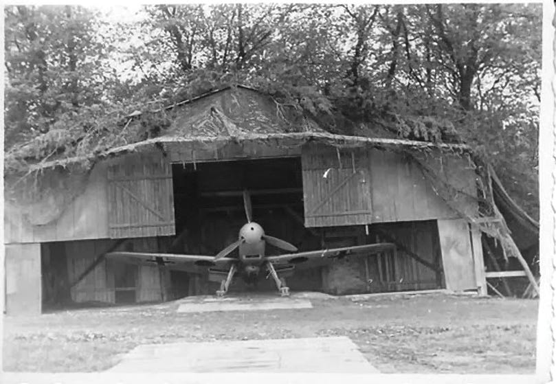 It seems that there was also a small radial aero-engine at left (two more are seen on the Jeep picture inside the first ‘hangar’) but this type could not be from a Fi 156 neither from an Arado 96, since both were equipped with the Argus As 10, an air-cooled inline inverted engine. Maybe a Fw 44 Stieglitz training plane? in that case it would be a Siemens-Halske Sh14 engine.